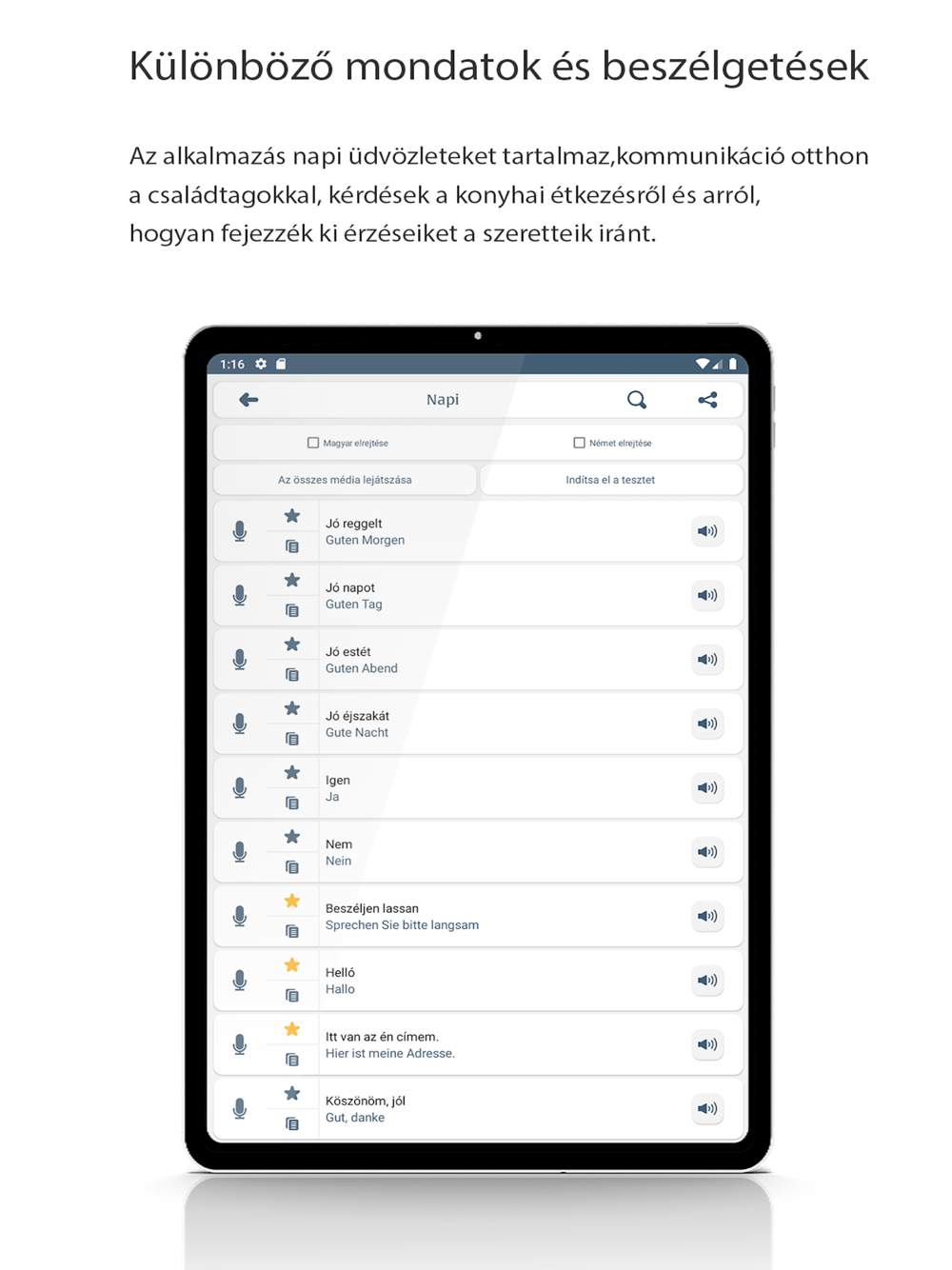 Az alkalmazás lehetőséget kínál arra is, hogy németül beszélőktől hangosan meghallgassák a mondatot.