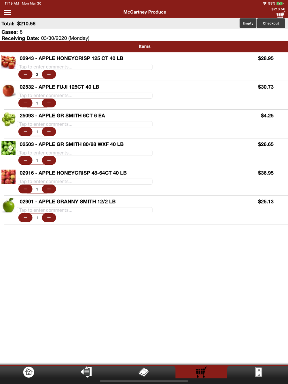 McCartney Produce Checkout gives customers a fast and simple option to place their next order. The app gives customers the ability to look through the items McCartney’s has to offer and makes ordering effortless. McCartney Produce is a distributor of fresh produce, dairy, frozen proteins and appetizers, local, specialty, and seasonal. If you would like to learn more contact us at mccartneyproduce.com