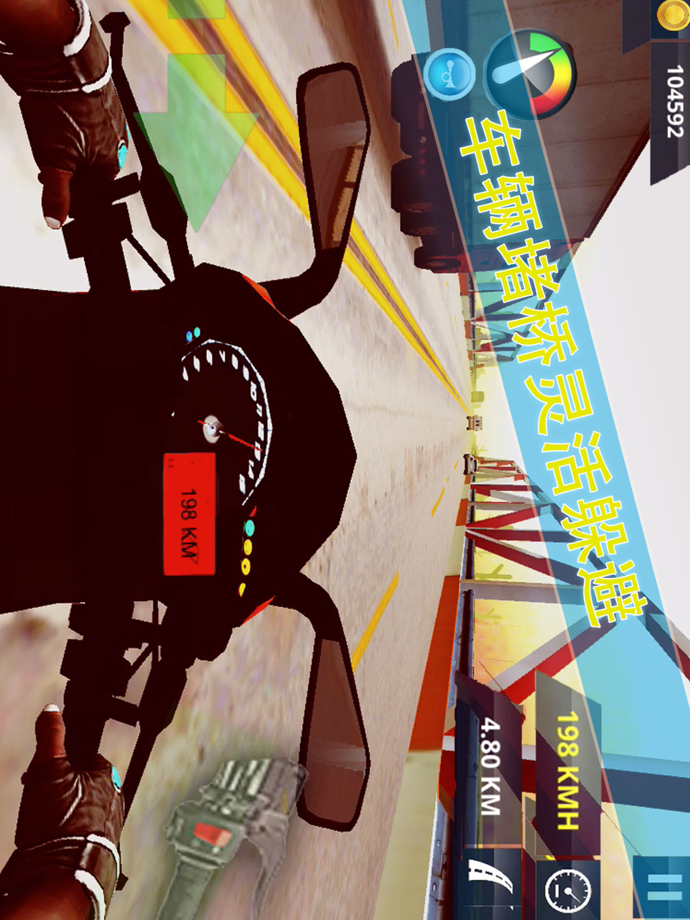 【小技巧】游戏中有重力感应、手柄控制、按钮控制前进方向,推荐用按钮来控制摩托车的前进方向,这样能更好地竞速,还可以取消摩托车的震动模式哦,更多功能,等你开启!