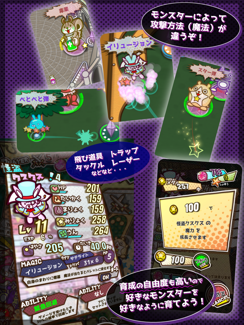 Cute 2D characters (monsters) hop around on pinball stage. and make lively battles with tackles and magics.
