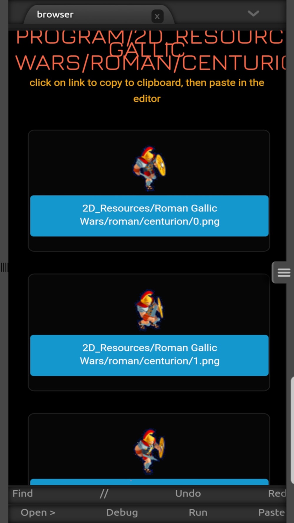To ease the use of your own assets, you simply place them in your DropBox folder, log to DropBox from Sprite Basic and load assets in your source from your DropBox (with a cache mechanism to make it faster). You can also import/export your sources and share your projects between your computer (Sprite Basic is also on desktops. You can download such versions on publisher website https://pix-arts.com ) and your mobile device.