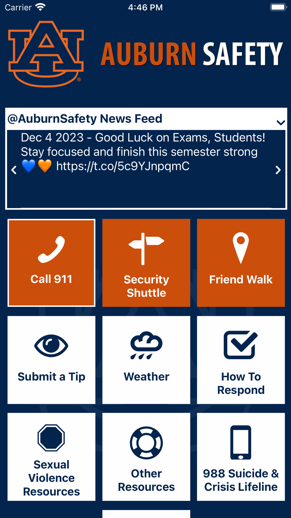 - Tip Reporting: Multiple ways to report a safety/security concern directly to Auburn University security.