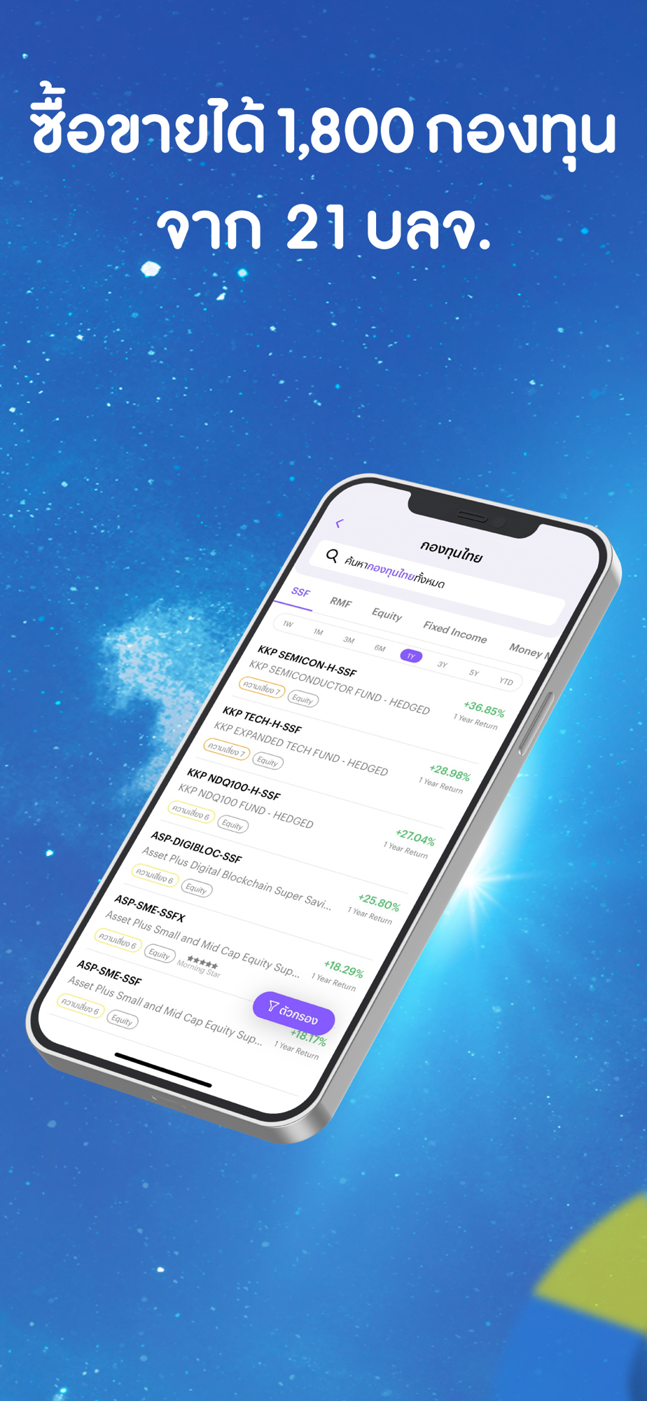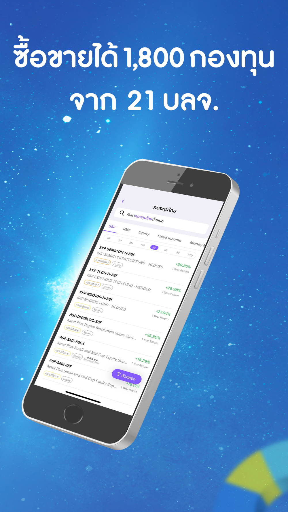 - กองทุน: ครบที่สุดมากกว่า 1,800 กองทุนรวมจาก 21 บลจ. ชั้นนำของไทย และกองทุนลดหย่อนภาษีจาก 18 บลจ.