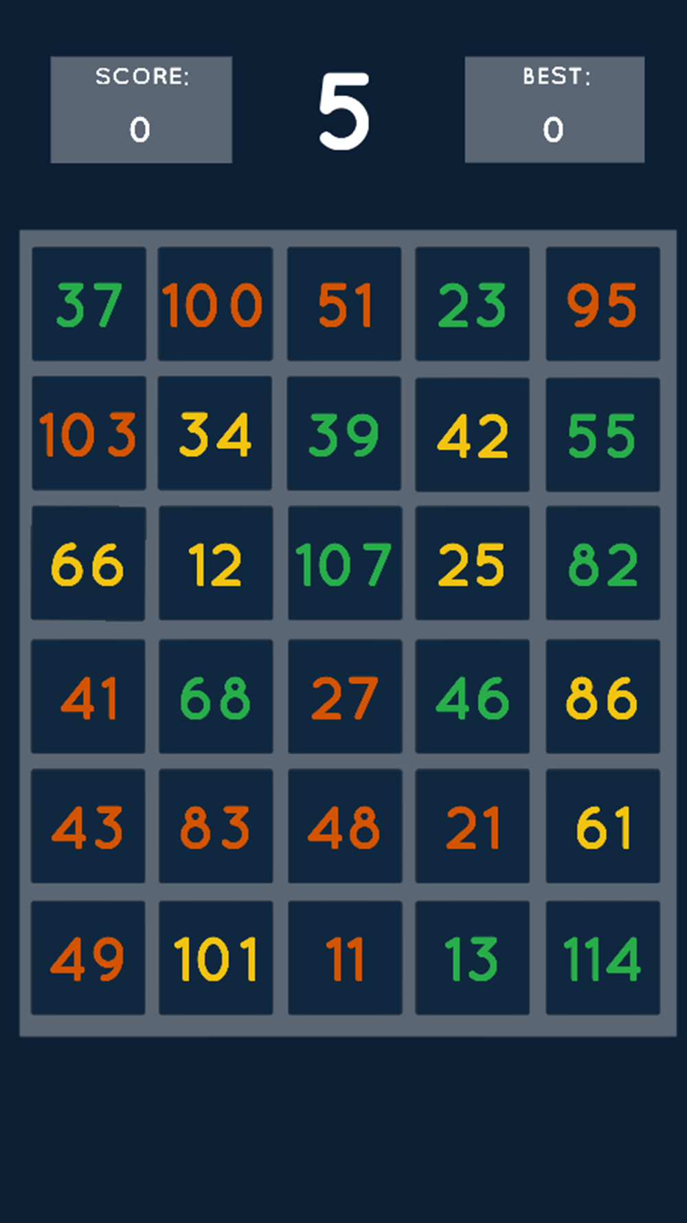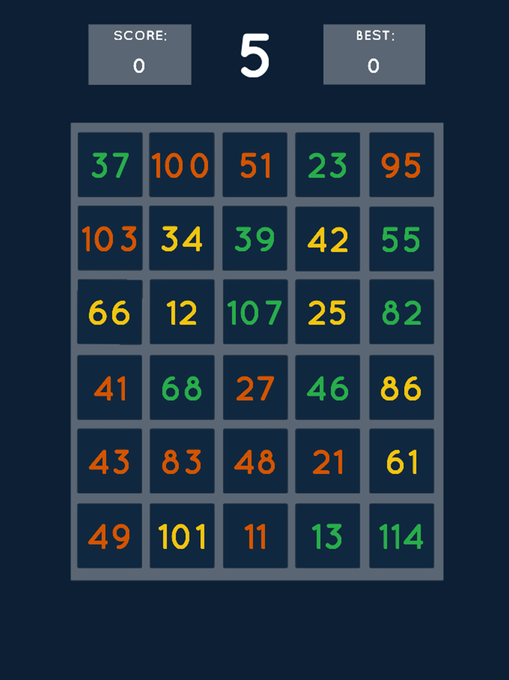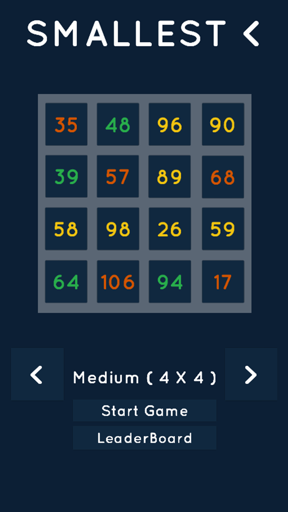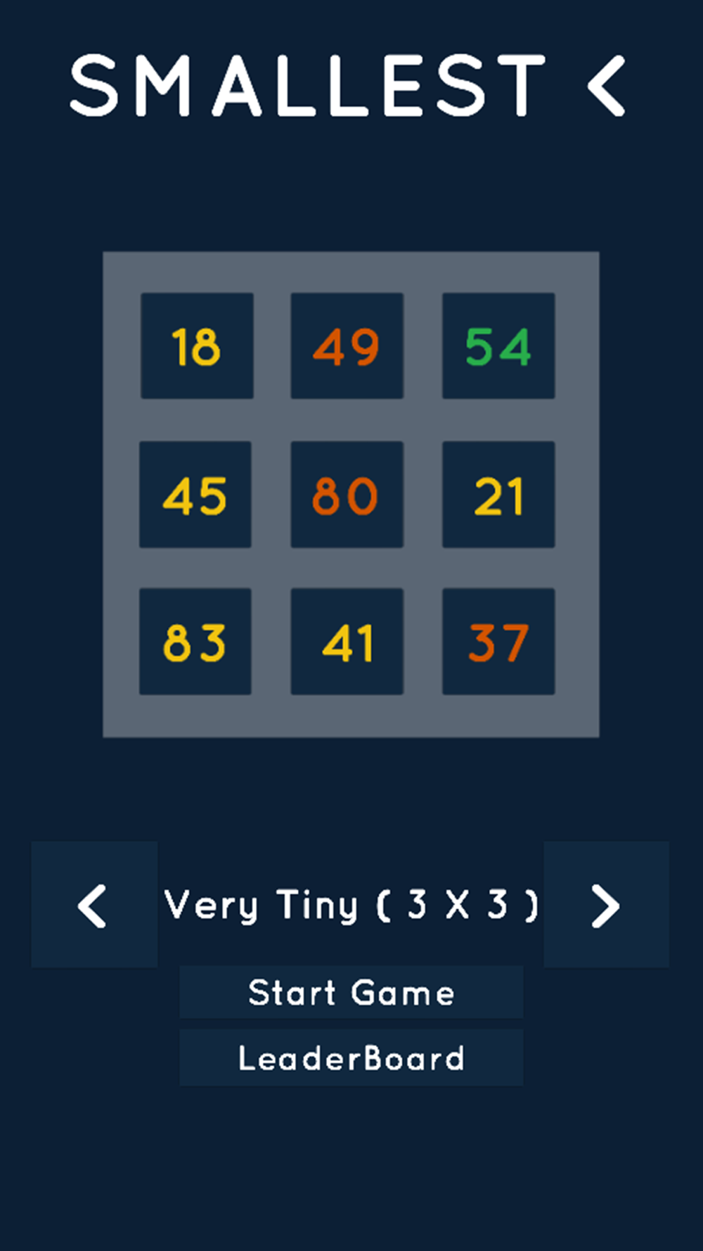 Smallest< has 6 different board sizes Very Tiny (3x3), along with Tiny(4x3), Medium (4x4), Large (5x4), Huge (5x5) and Giant (6x5). Can you set the highest score for each of the 6 leader boards?