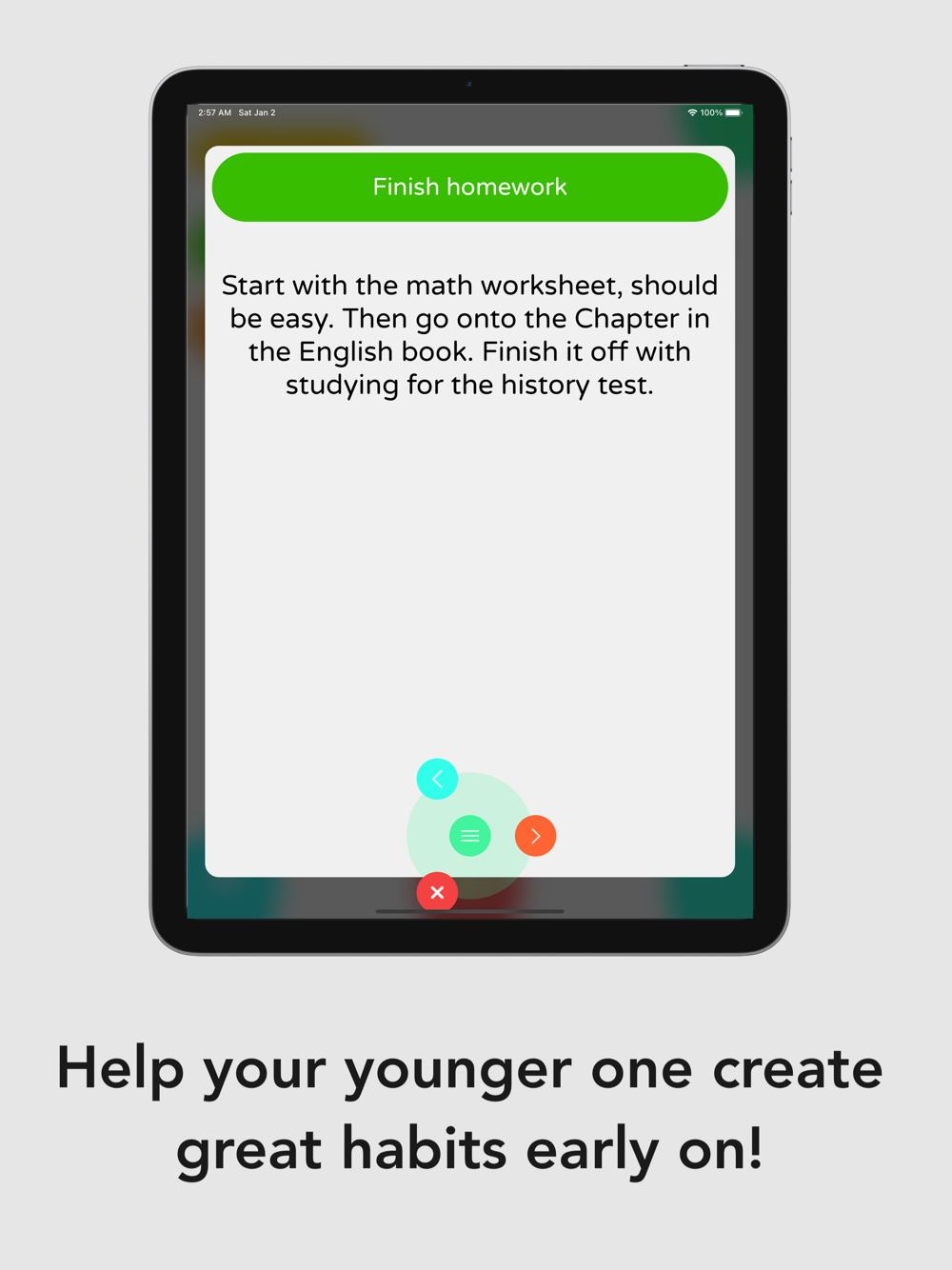 This app is great for any parents who might want to help their child get into making lists and tasks but don't know where the start. The design was optimized so that children can create the best habit there is out there, at such an early age.