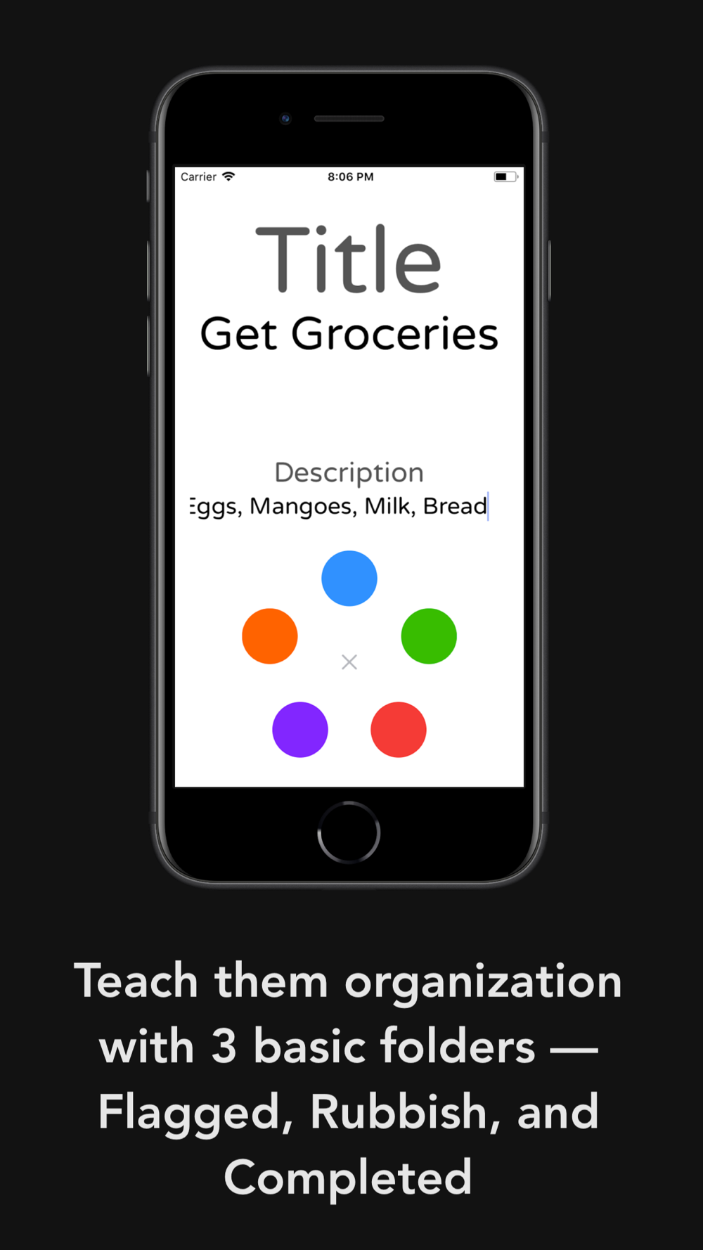 This is an easy to use list app. You can organize it through different colors and you can archive it, trash it, and set it complete. And it uses fun little transitions that make it feel better to use.