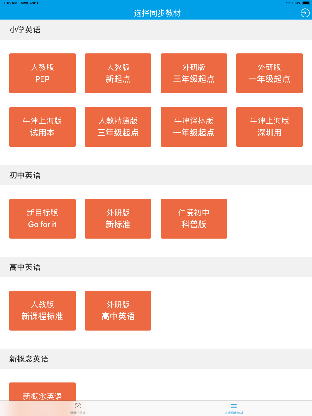 包含了小学英语、初中英语、高中英语大部分教材,可随时切换您的教材,并且更多教材在持续更新中。目前教材有如下:
