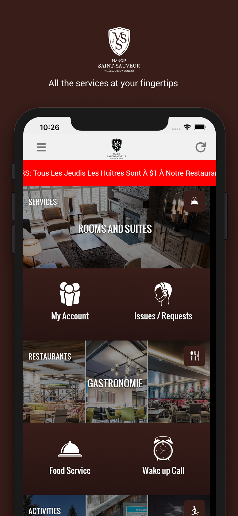Mosino Hospitality Platform for Hotel Manoir Saint-Sauveur offers hotel guests many services ranging from digital concierge, digital signage, various reservations options as well as entertainment. Choose from a range of services the hotel offers.