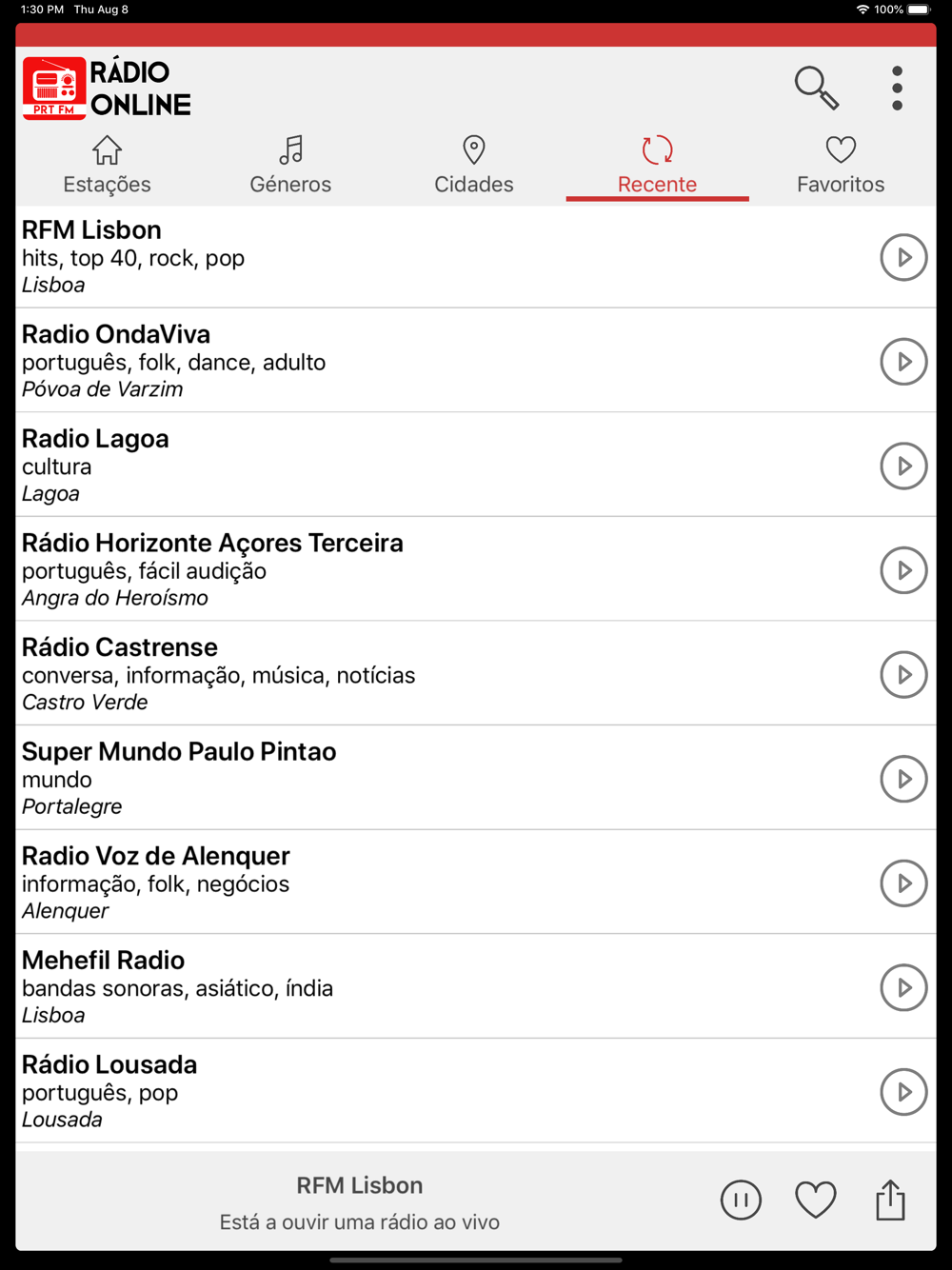 As opção de "Recente" lista as últimas 50 estações de rádio ouvidas para que possa sempre voltar e ver o que ouviu anteriormente.