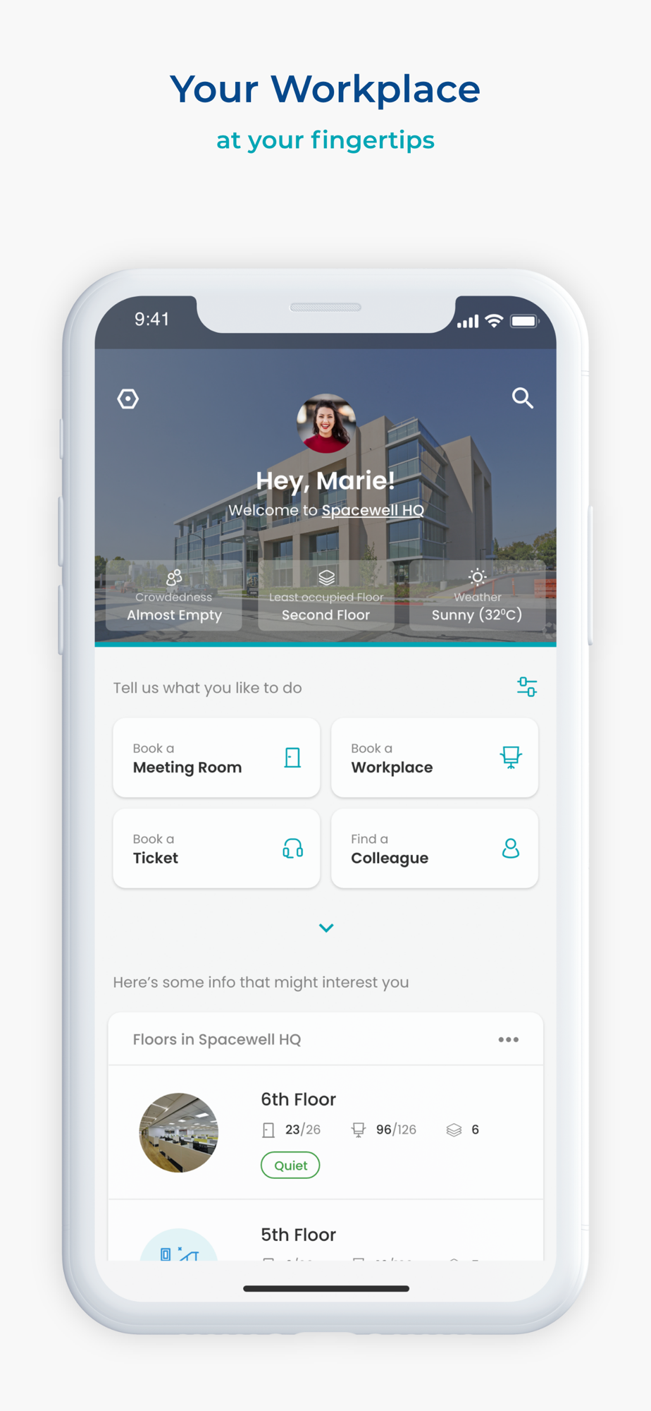 • Find your way to your booked space with guidance on a floor plan