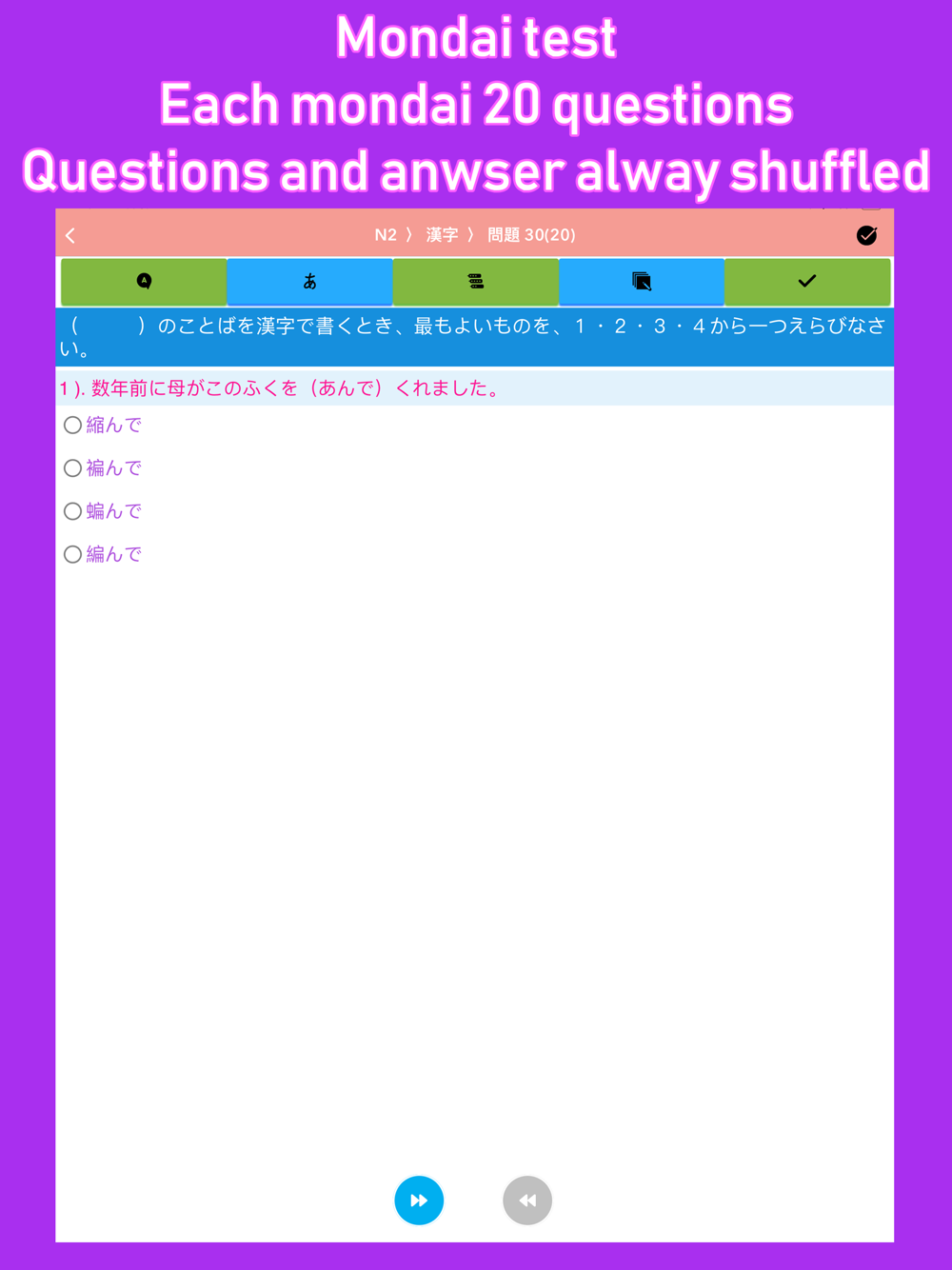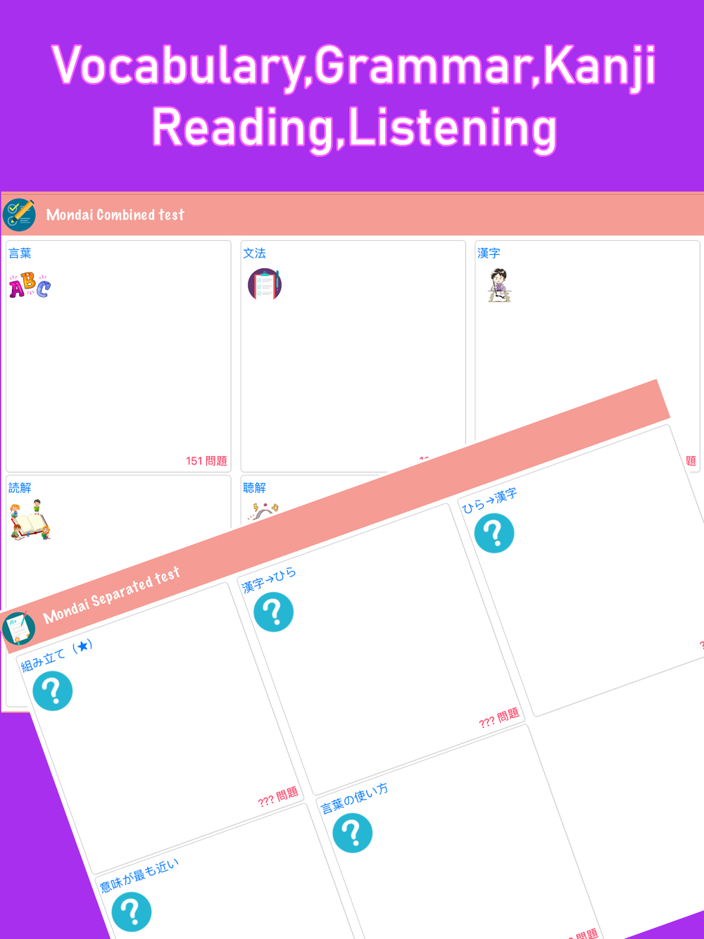 + Let’s the JLPT Test App help you increase 50 JLPT points. With more than 40,000 JLPT questions, 1500 reading comprehension and 200 JLPT exams from previous years will be the exam preparation book to store your progress.