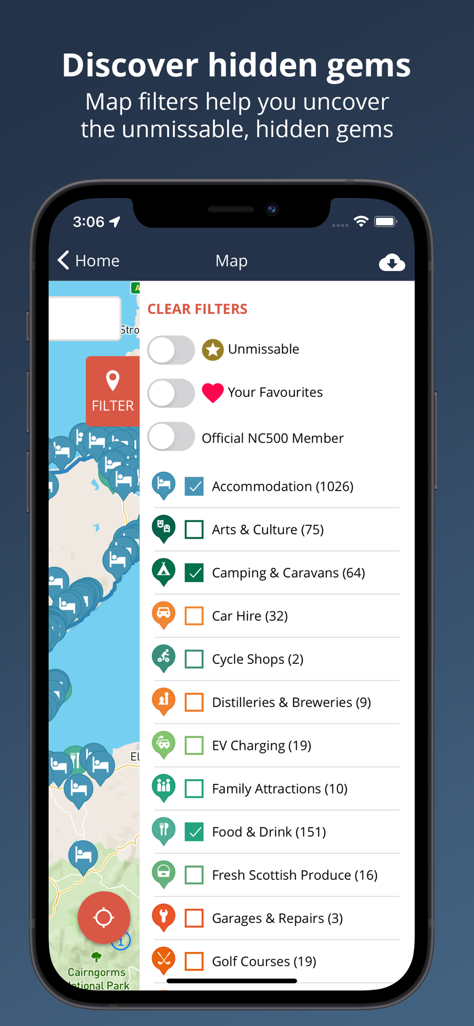 Tailor your trip - Powerful map filters let you tailor your trip, whether you want to discover a hidden gem, find a scenic view, natural wonder or historic building. Or even just the closest car park!
