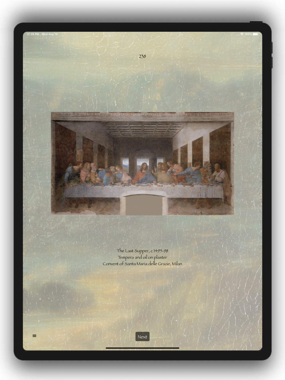 To help you learn this app tests your knowledge along the way and challenges you to reach 500 points to commemorate the 500 year anniversary of da Vinci's passing.