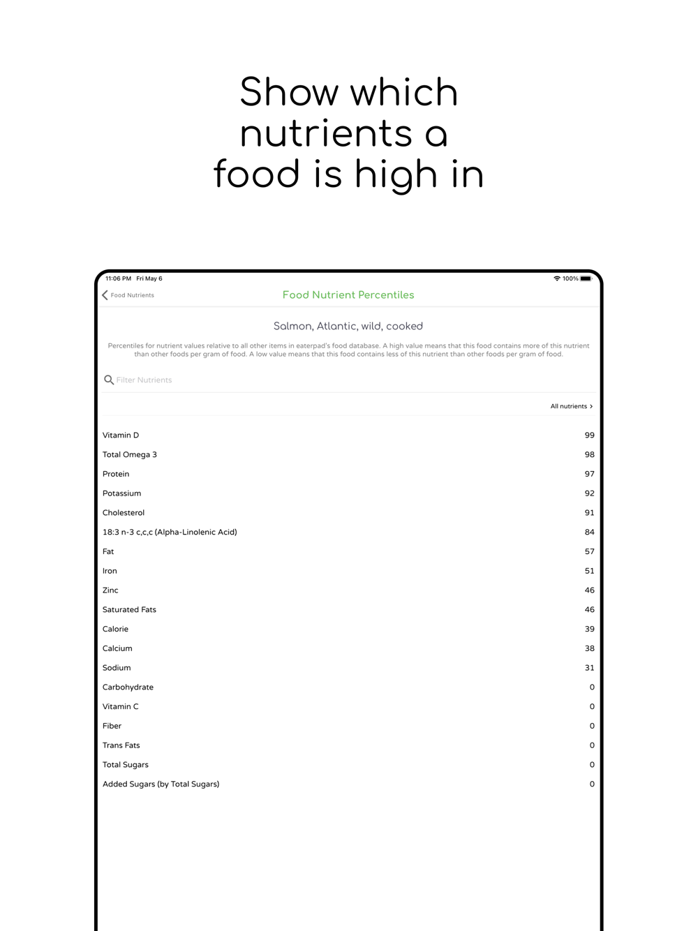 Rank nutrients in a food by percentile