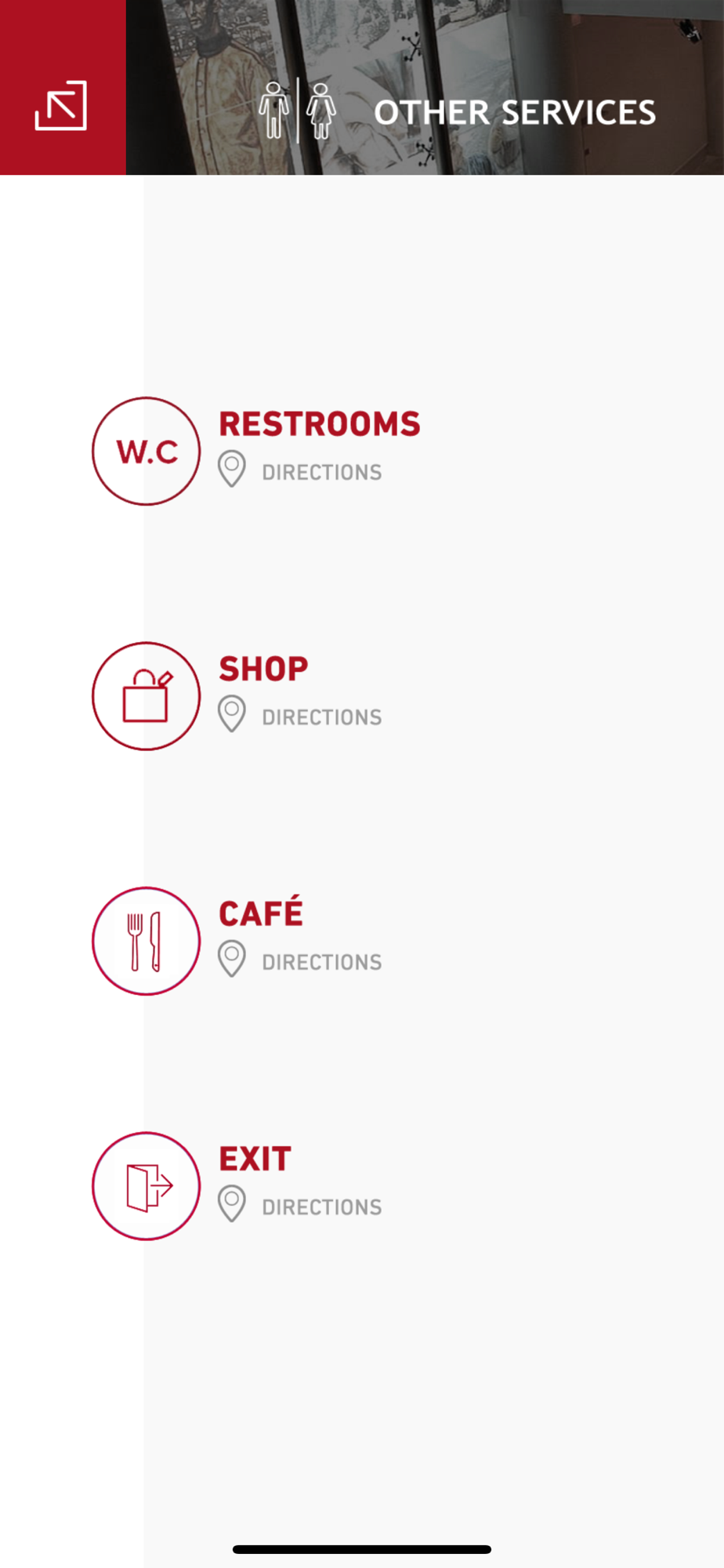Interactive map with indoor location and gps system that will provide your exact location anytime, and easy-to- follow directions to any place in the museum (all routings are also available for handicapped people).