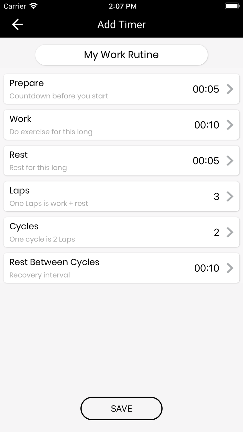 • Customize Work time, Rest time, Round (Lap), Cycle