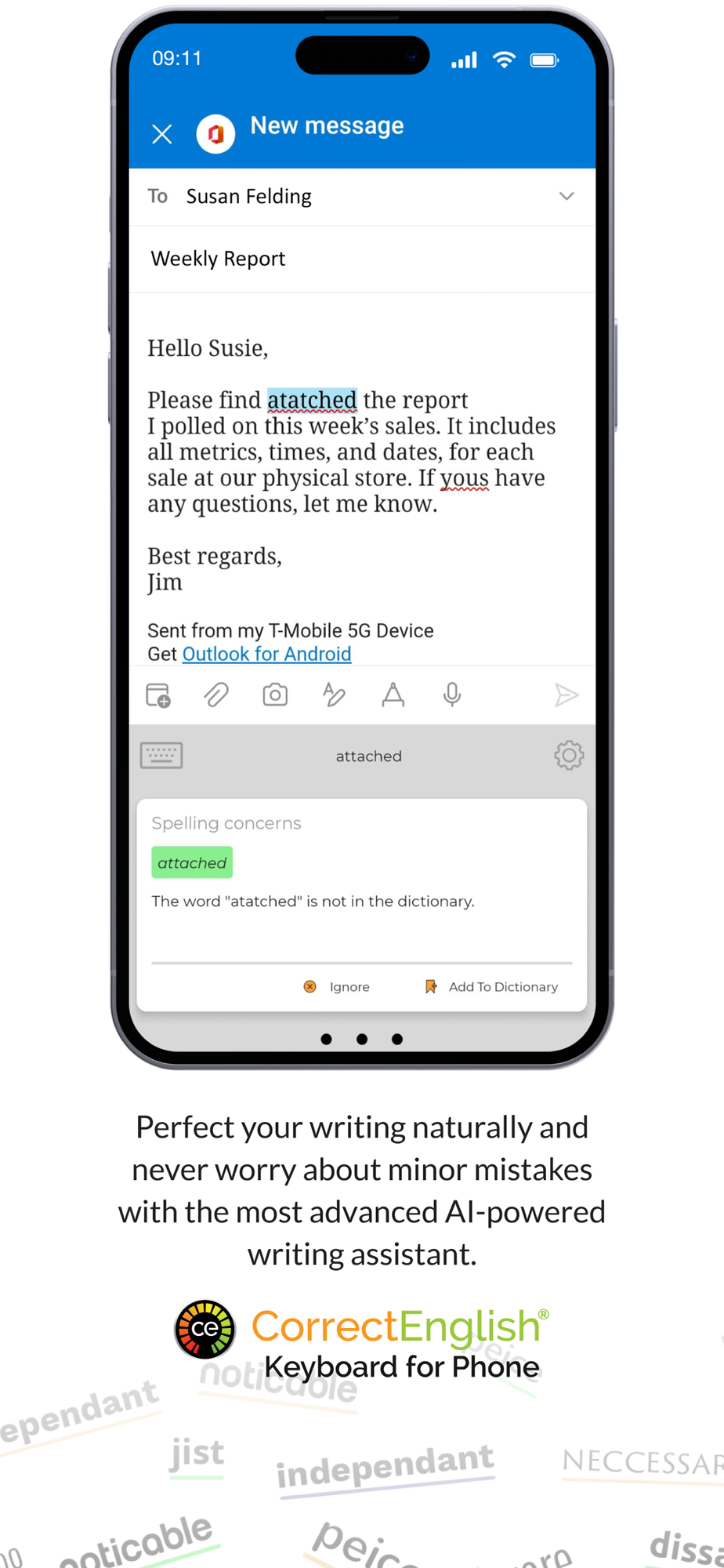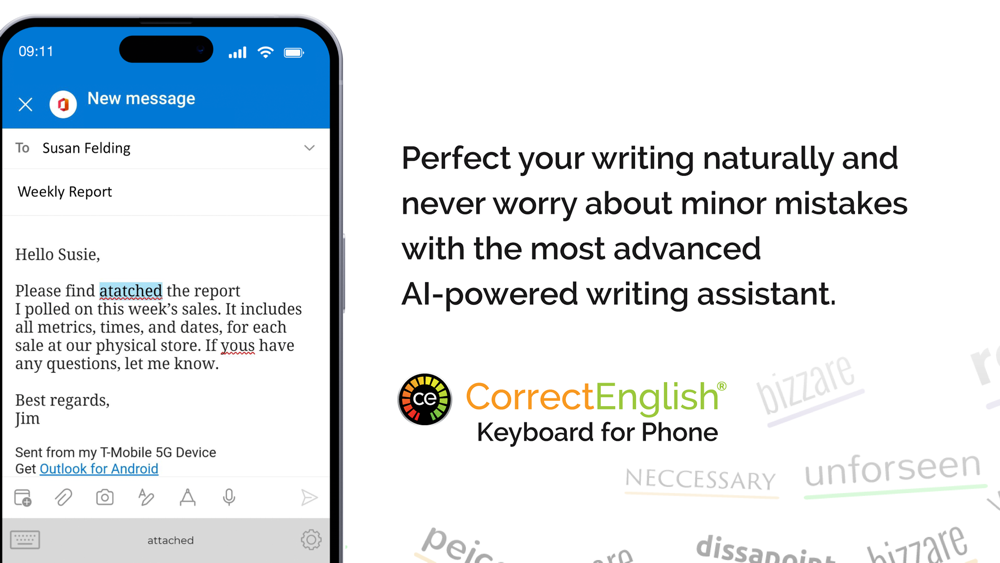 To improve your writing skills, simply download and set up the CorrectEnglish® keyboard. Then, type anywhere on your Apple device. Whether you type in a browser, email, or any other app, CorrectEnglish® will instantly identify corrections in a small box above your keyboard. Click on the box with the correction to make the change.
