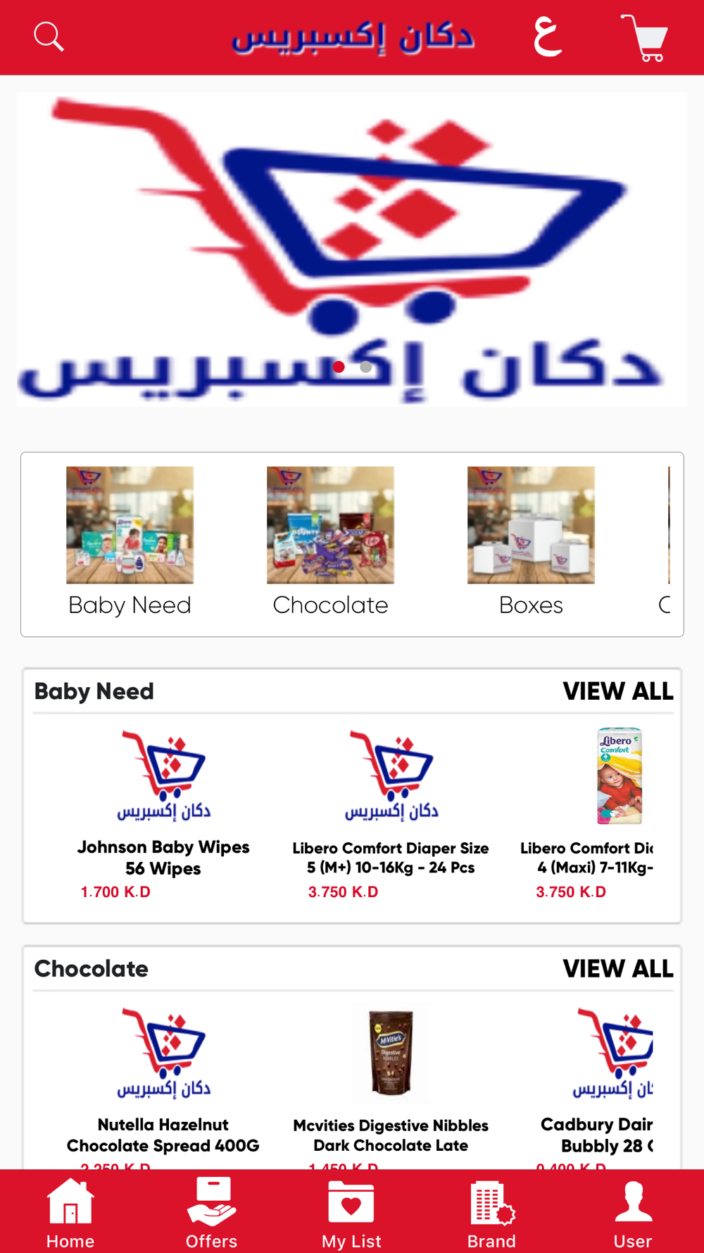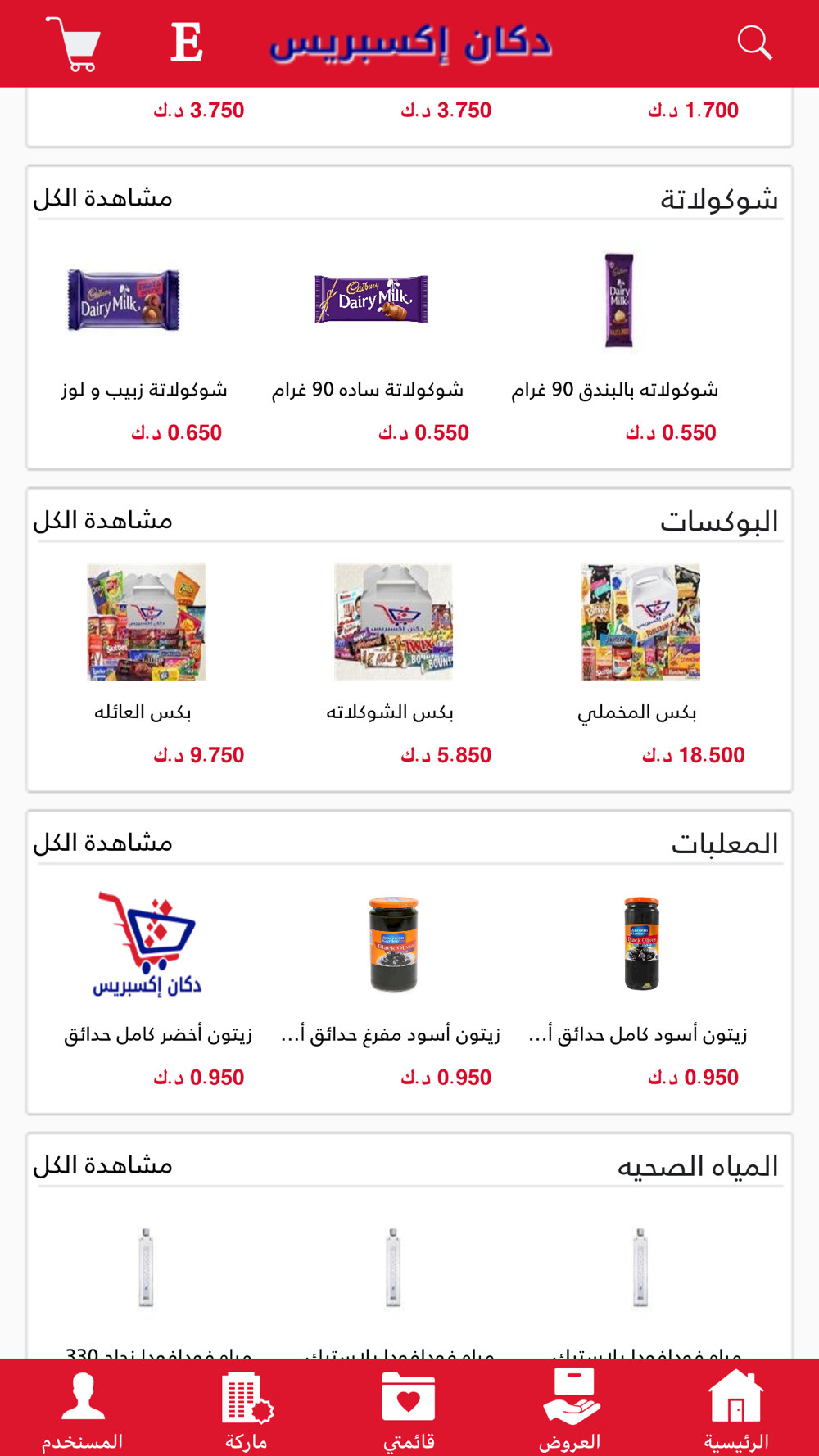 تطبيق للتسوق في بقالة دكان اكسبرس يتيح لك البحث و تسوق في اكثر من منتج من كل فئات التسوق مثل المنتجات الغذائية و الاستهلاكية و لوازم المنزل و منتجات صحية