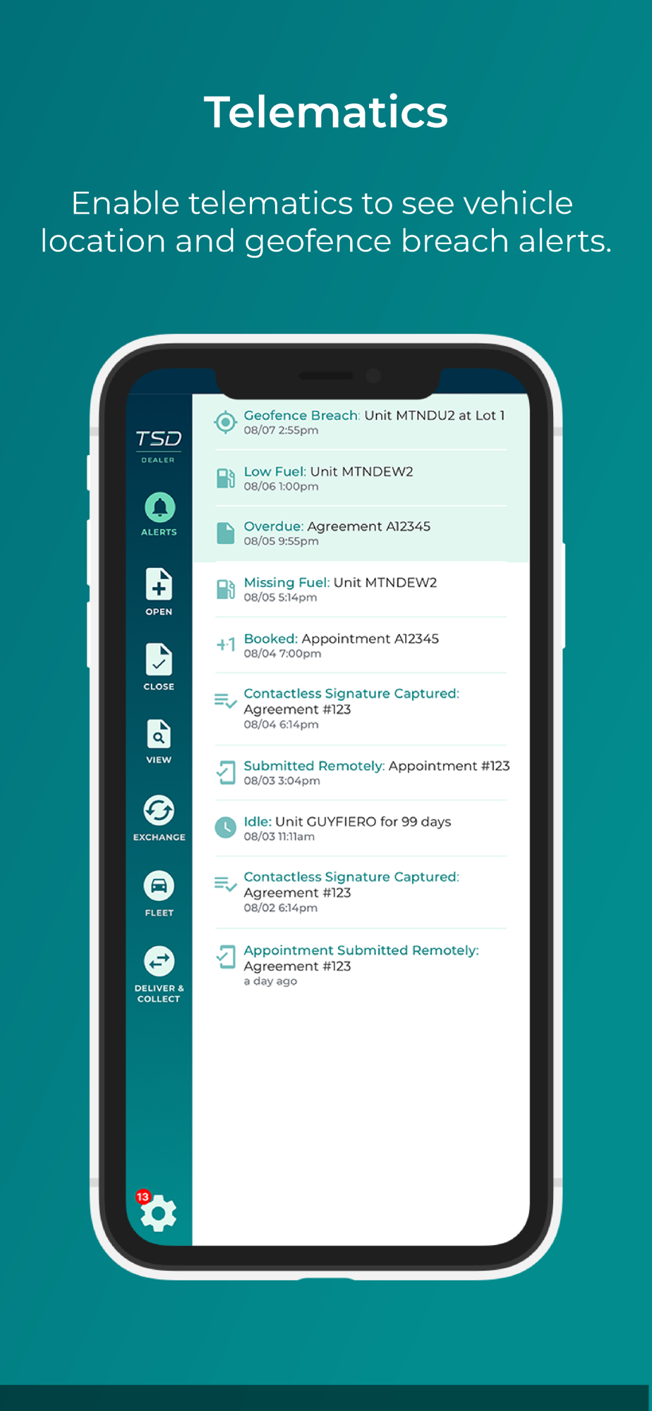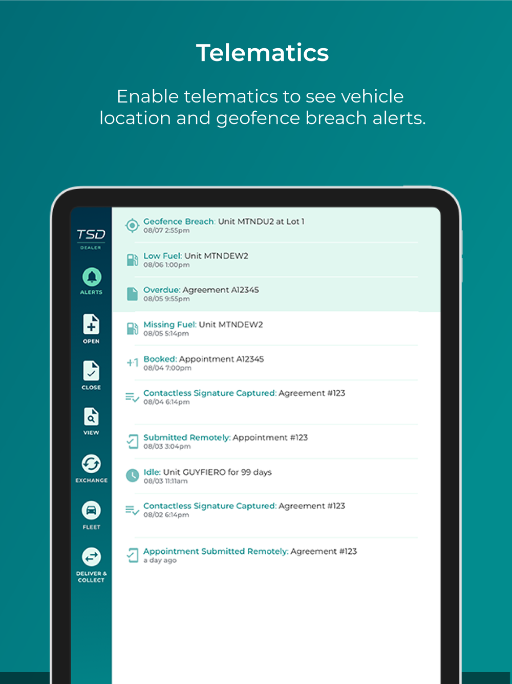 Securely manage your fleet with the TSD DEALER mobile app. Our newest dealer solution brings together a 100% contactless experience with connected vehicle analytics. Open an agreement, scan a driver’s license, or check your fleet availability in seconds from your iOS device.
