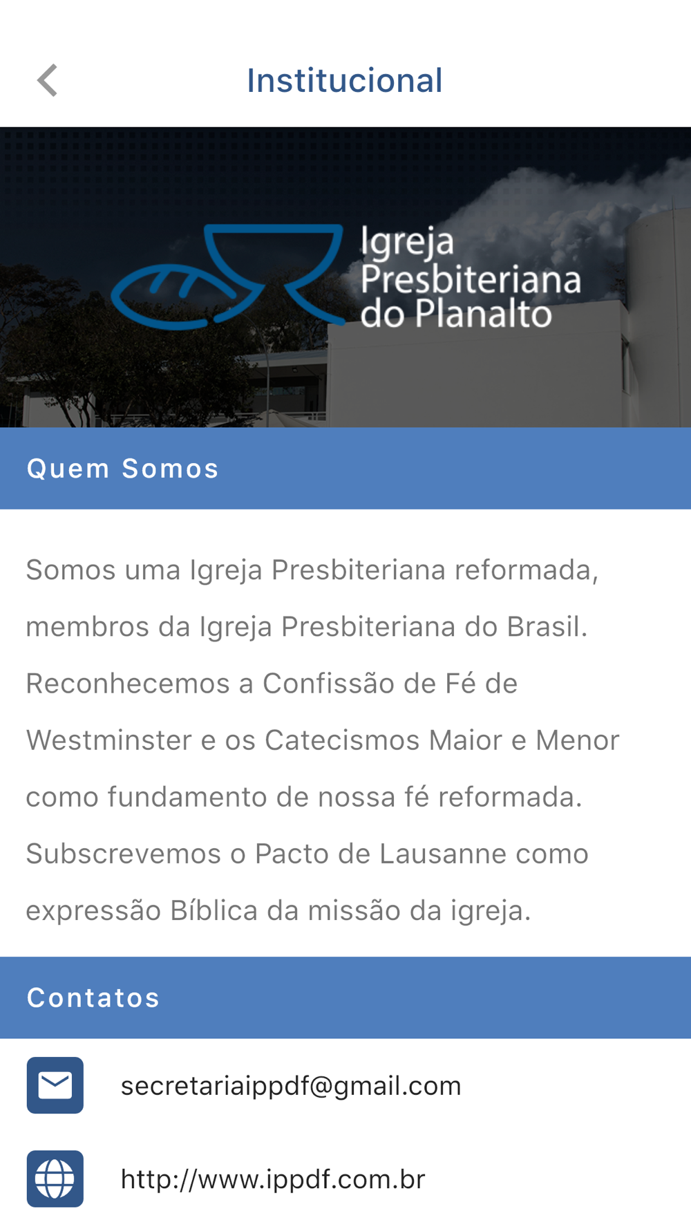 Seja muito bem-vindo ao aplicativo da IPP (Igreja Presbiteriana do Planalto). Aqui você pode conhecer mais sobre nossa comunidade, suas programações, boletins, notícias, estudos etc.