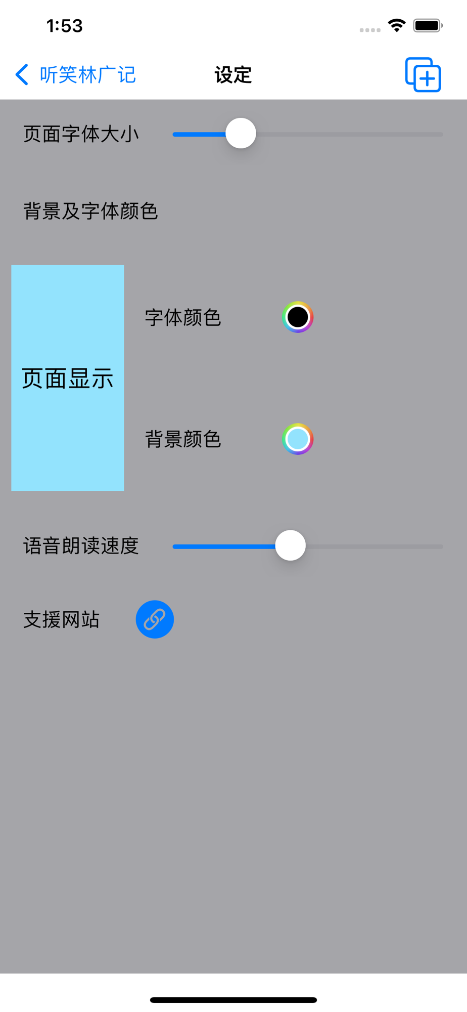 4. 阅读时, 读者可以自定义字体大小, 颜色, 页面颜色. 下次使用时, 回到读过或听过的部数与篇数.