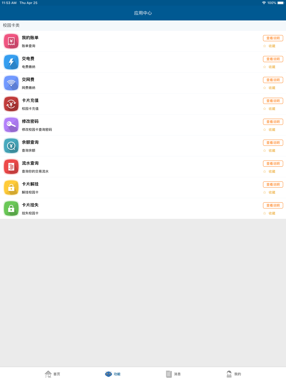 提供全面的校园卡服务,充值、信息查询、账单查询、流水查询、挂失/解挂、失卡招领、校园卡在线申请、校友注册等