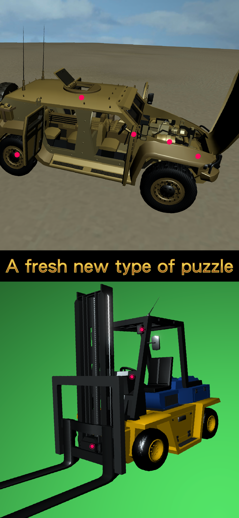 Once the model is completed, you can change its colors, play animations and sounds, and watch as parts of the models move and operate. Of course, you can view the model in more detail by panning, zooming and rotating around the the scene to view the model from all angles. Additionally, the parts menu is randomized allowing you to try your hand at the model again and again, and giving the chance to beat hiscores on the in-app global leaderboards.