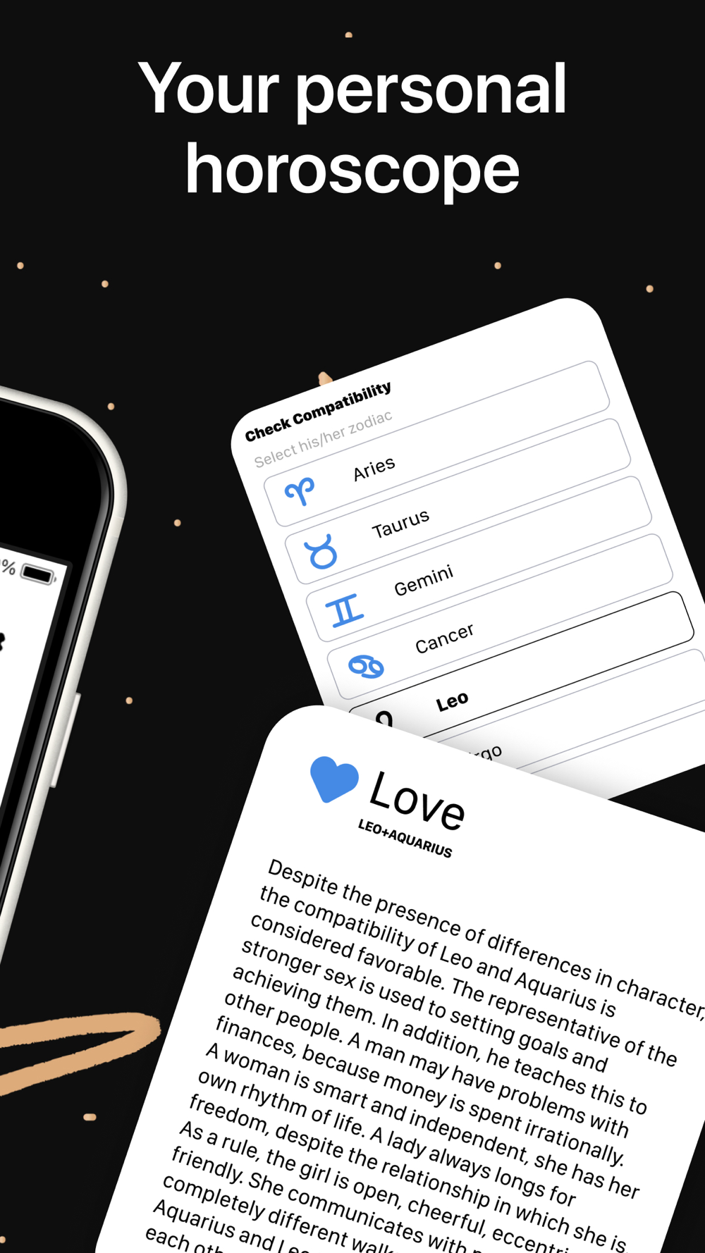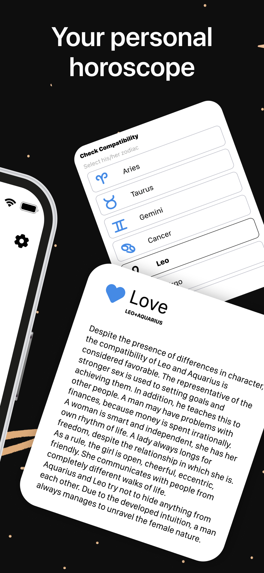 Personalized horoscope - the app provides daily, weekly, and monthly horoscopes, finely tailored to your specific zodiac sign, offering you astrological insights on-demand.