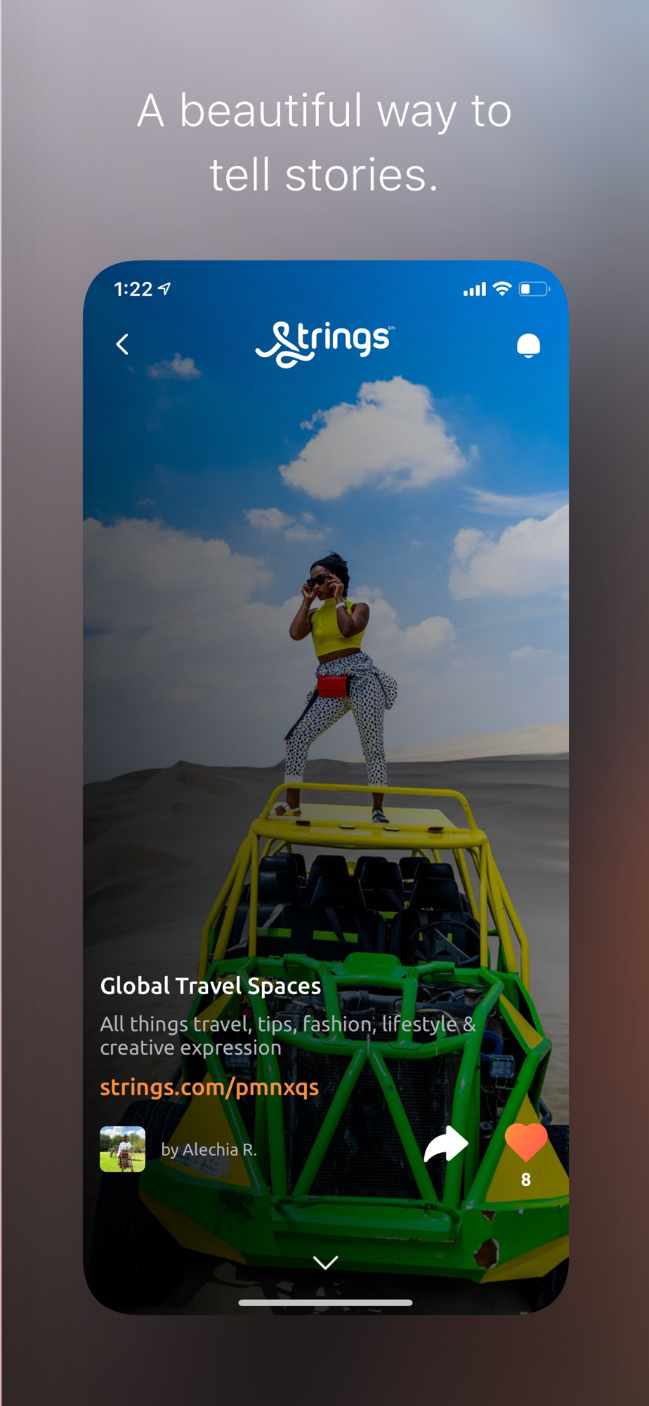 Strings is a beautiful way to tell stories. We made Strings to serve you, a storyteller! We made it to work with your existing social accounts so you can easily extend your reach with strings that go deep and capture your audiences in ways existing social media can’t.