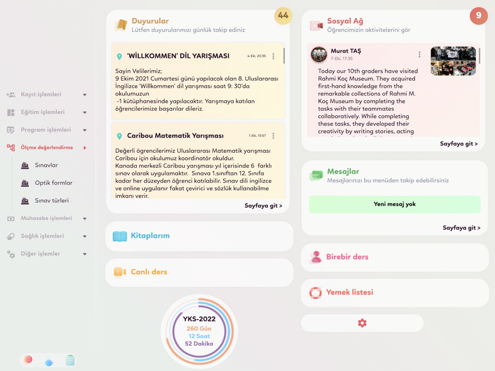 Okul yönetim sistemi, Teknokent Kolejlerinin ihtiyaç duyduğu programları tek çatı altında toplayan, esnek ve işlevsel bir okul yönetim sistemidir. Uygulama sayesinde kurumlardaki tüm süreçler bir bütünlük içerisinde yönetilebilecektir. Yapay zekâ tabanlı okul yönetim sistemi kolej, özel okul, devlet okulu, etüt merkezleri gibi değişik türlerdeki eğitim kurumlarına uygun olarak geliştirilip, kurumların ihtiyaçlarına göre şekillenebilmektedir. Kurumlar için tüm akademik ve idari işler sistem üzerinden yürütülebilecek ve sistem içerisinde saklanabilecektir. Kullanıcı dostu ve son teknolojik altyapı kullanılarak hazırlanan uygulama modüler alt yapısı sayesinde sadece istediğiniz hizmetleri uygulama içerisinde alabilecek ve kullanıcılarınıza sunabileceksiniz. Farklı kurumların farklı ihtiyaçlarına göre şekillenebilen uygulama ile kullanılmayan modüller kurumlar için ek bir maliyet yük sağlamaz. Yapay zekâ tabanlı okul yönetim sistemiyle eğitim sektöründe hizmet veren kurum veya kuruluşların işleyiş aşamalarına mobil dünyanın hız ve becerilerini ekleyerek daha etkin ve verimli çalışmasına katkı sağlayacaktır.