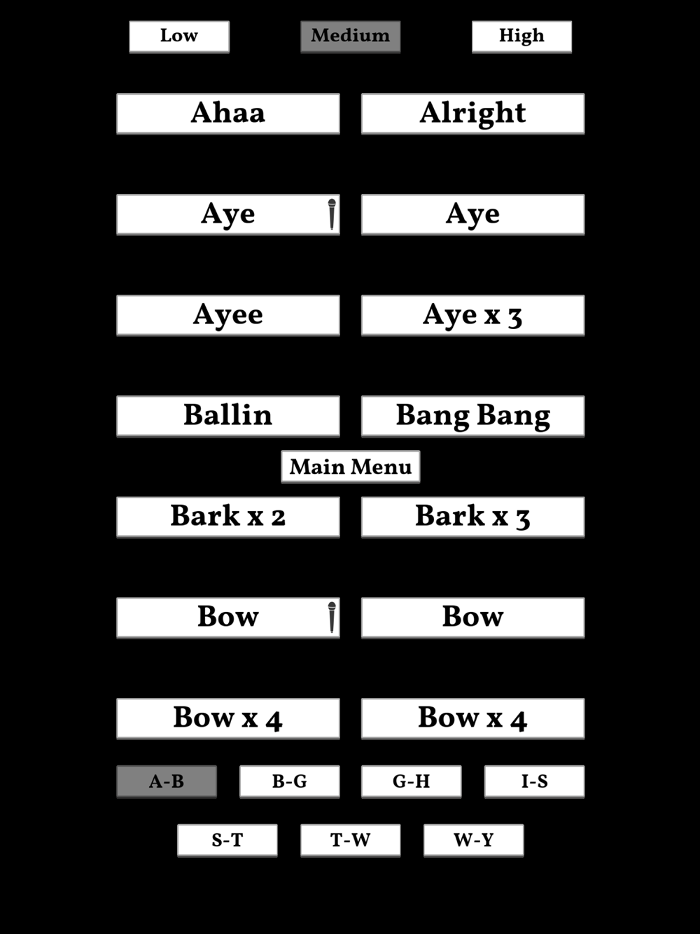 This app also includes a favorites feature. Simply hold down on a button for 5 seconds to select or unselect it as a favorite. There are various Yeahs!, Ayes, Skrrt Skrrts, and Bows! so this is a good way to remember which sound effects are your favorite.