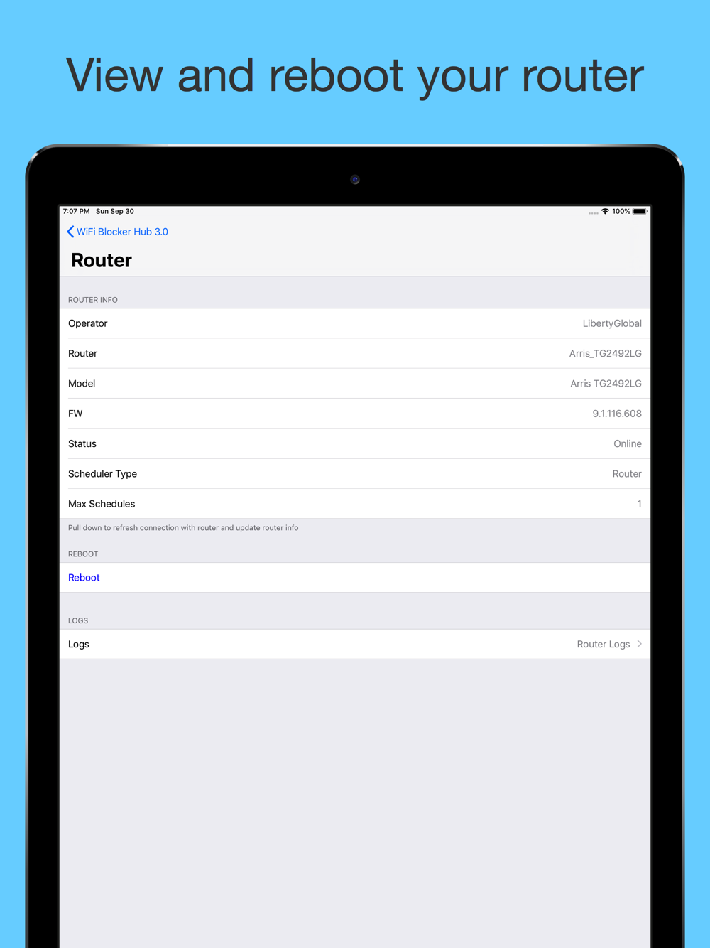 This app is a control centre for your Virgin Media Hub 3.0 router with emphasis on Parental Controls. Your router is your front door to the internet, you wouldn't let your kids wander around outside when they're meant to be in bed sleeping, this app gives you the keys to lock the internet. Take control of your internet today.