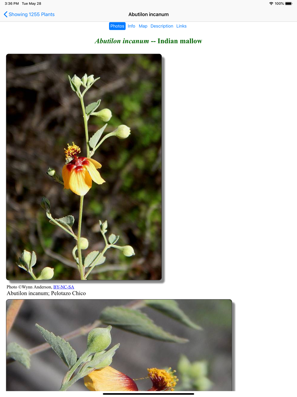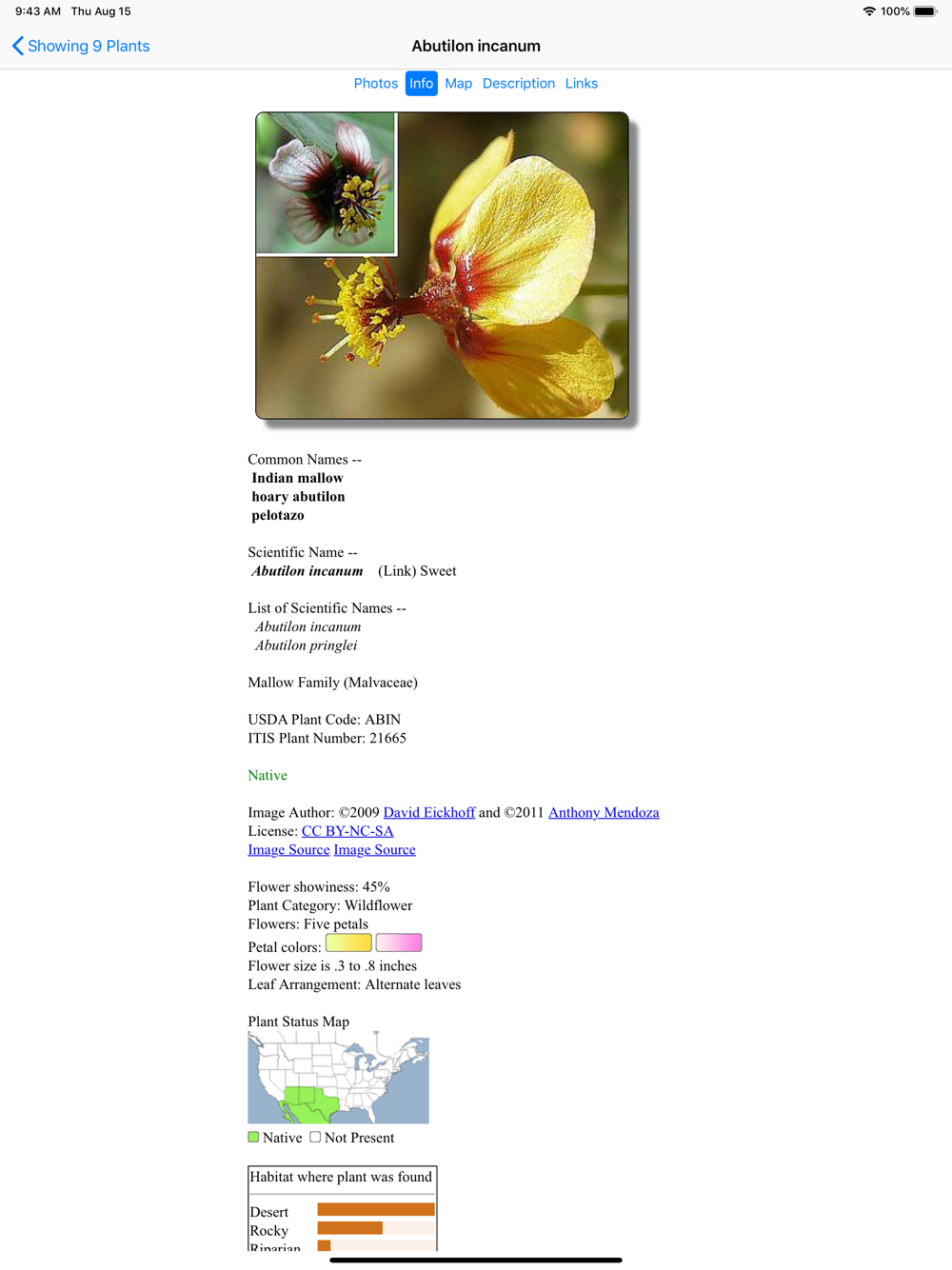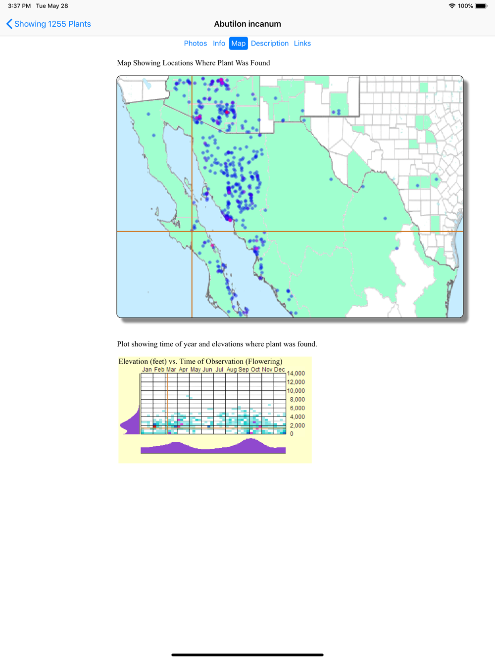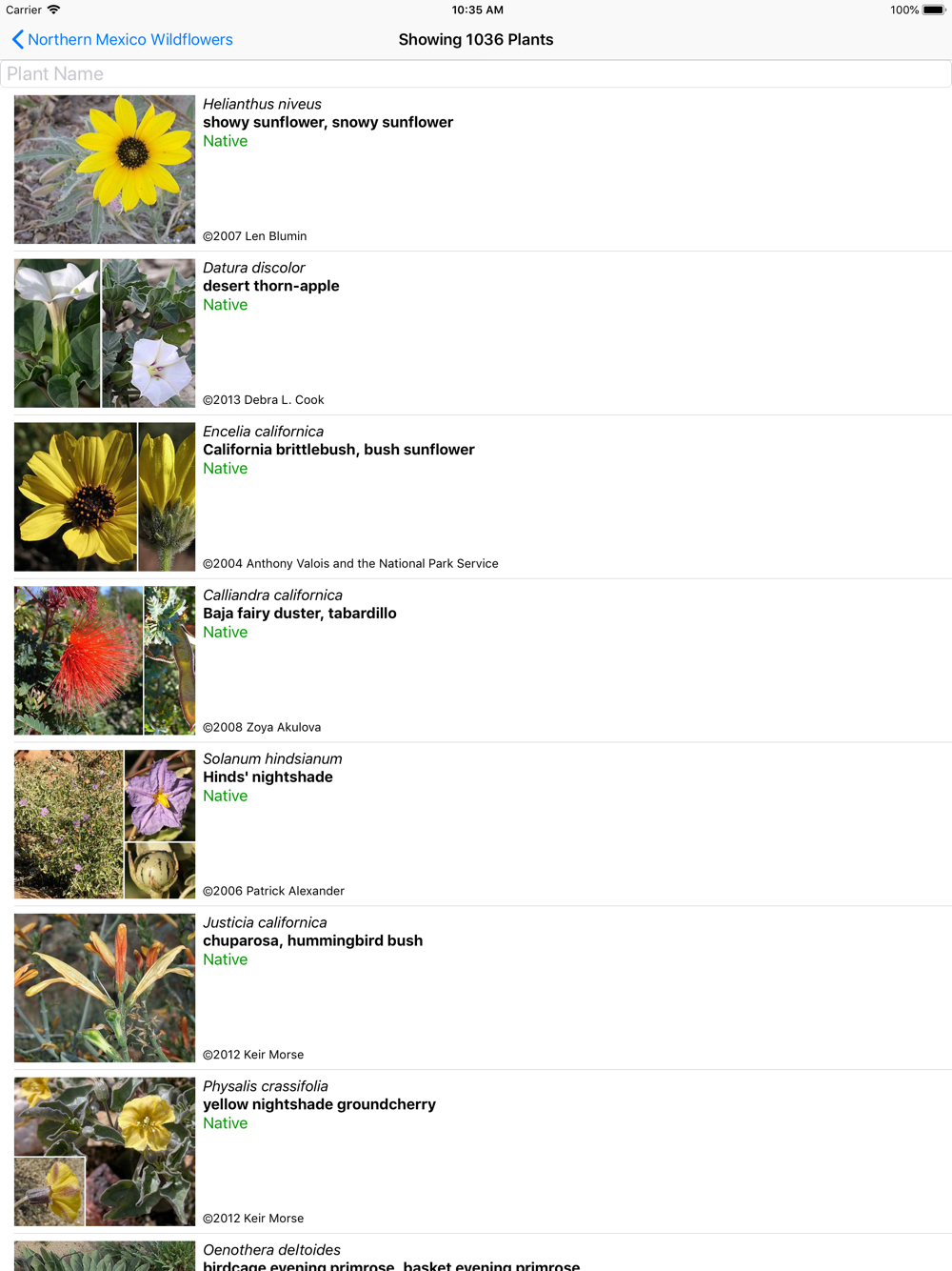 The App includes 4,506 species of plants found in Northern Mexico. Overall, 2,491 are "Wildflowers", 599 are shrubs, 336 are broadleaf trees, 43 are conifers, 149 are vines, 83 are cactus, 475 are grass-like, 120 are fern-like, 167 are moss-like, 93 are seaweed and 273 are lichen.