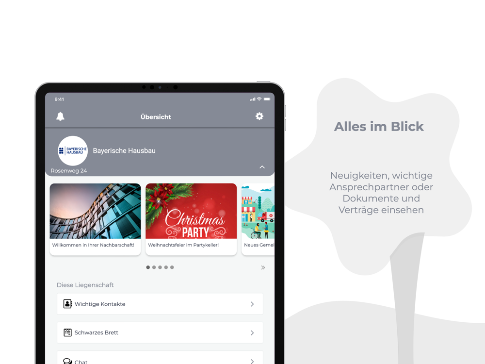 Herzlich Willkommen in der digitalen Welt der Bayerischen Hausbau. Starten Sie mit unserer App unkompliziert in einen regelmäßigen Austausch rund um Ihre Wohnung. Sie können 24/7 über alle Anliegen Ihrer Liegenschaft direkt mit der Hausverwaltung kommunizieren, Benachrichtigungen, Mitteilungen und Termine erhalten, Dokumente einsehen, Abrechnungen abrufen, Schäden melden, mit Mitbewohnern über das „Schwarze Brett“ kommunizieren….