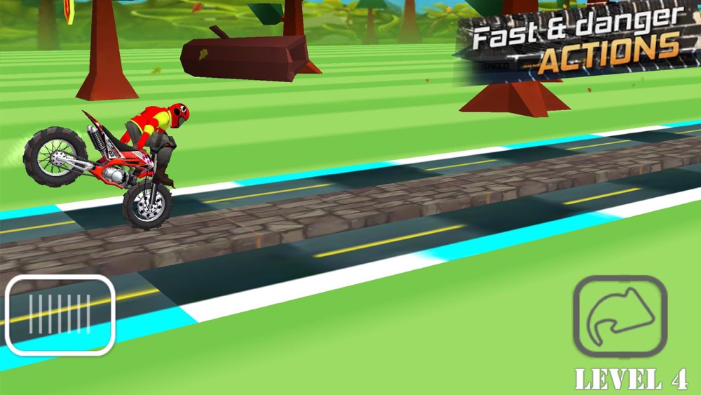 Put your helmet on and get ready for some action, crash, jump and wheelie. Nonstop fun and danger but suitable for the kids also. You'll have to think smart and race will skill to get over all of the obstacles on the track. Plan your run carefully and don't get too carried away or you'll fall off your bike.