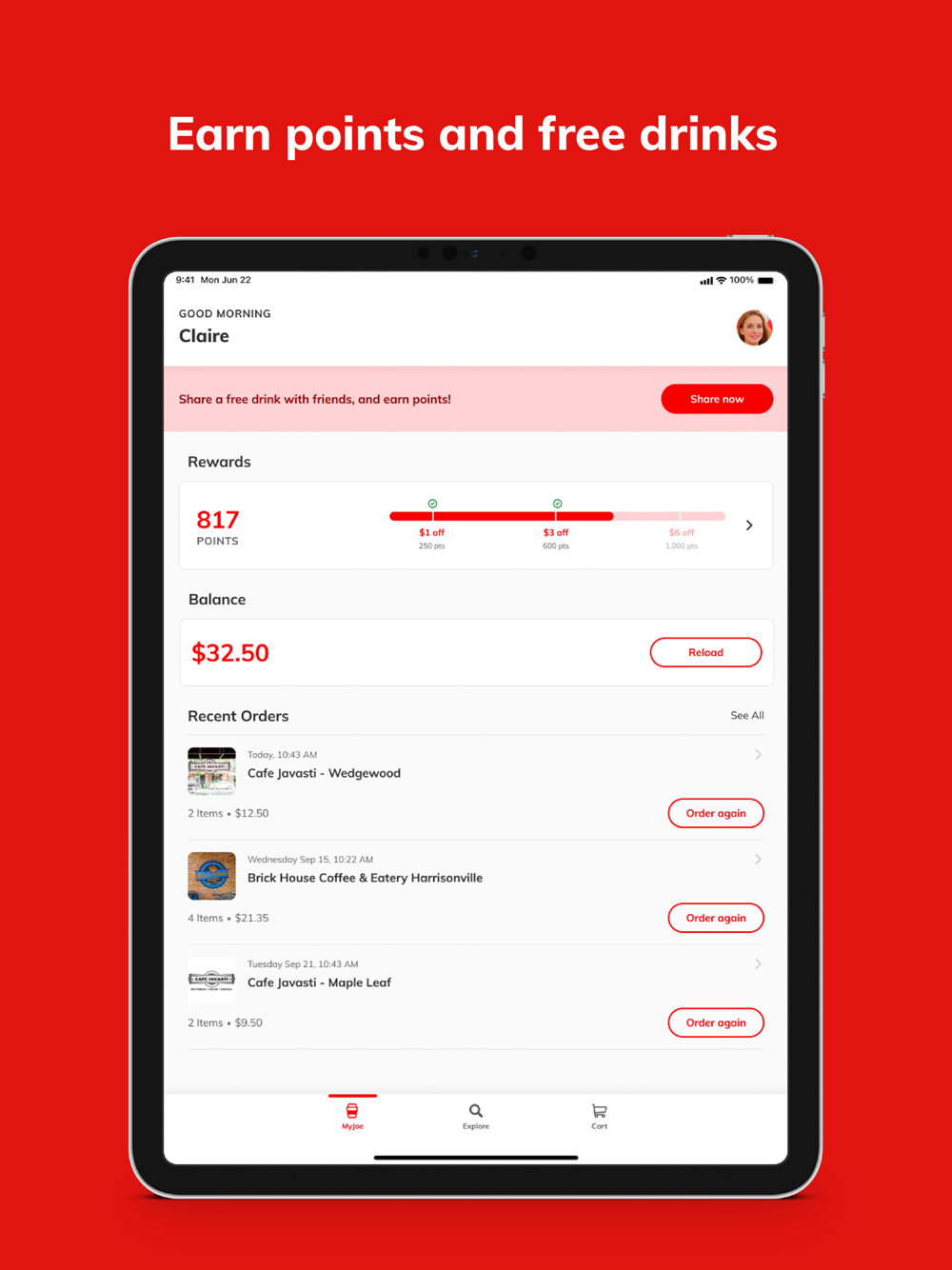 With every order, you earn points that can be redeemed for free drinks and deals anywhere on the network. You’ll also receive deals, discounts and promotions that you can use to save money and discover new experiences.