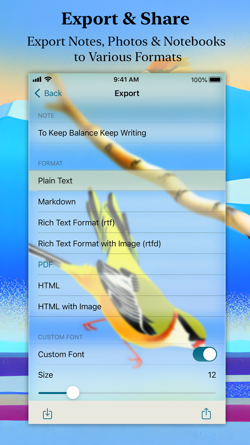 •	Export & Share notes, photos & notebooks to plain text, markdown, rtf, html, pdf, etc.