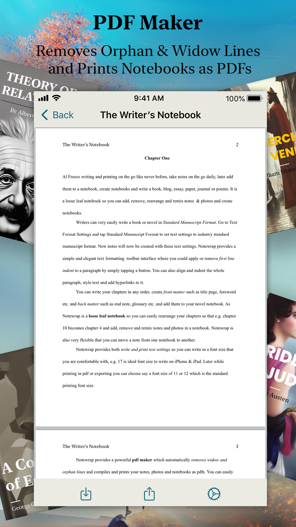 Whether you are a writer writing stories, poems or articles, blogger writing blog-posts, student writing essays, assignments or reports, researcher writing research papers or simply someone who is into journaling and maintains journals such as gratitude, food etc., with Notewrap you can easily create such writings as notebooks your way on the go as it provides a simple and elegant interface and lets you take notes a paragraph, scene or chapter at a time and gives you complete control in the way you want to create and style your writings.