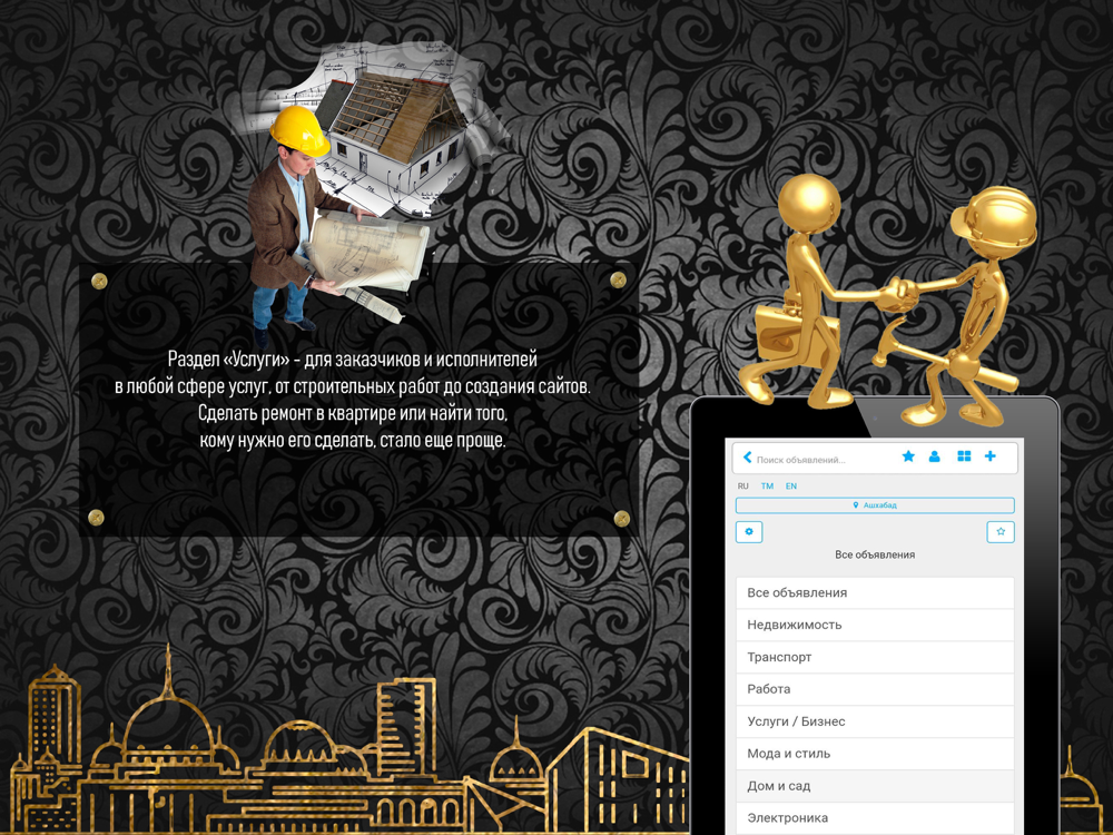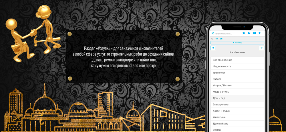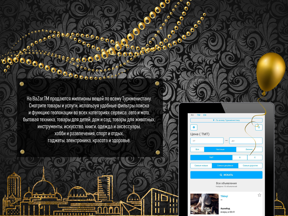 На Базаре продаются миллионы вещей по всему Туркменистану. Смотрите товары и услуги, используя удобные фильтры поиска и функцию геолокации во всех категориях сервиса: авто и мото, бытовая техника, товары для детей, дом и сад, товары для животных, инструменты, искусство, книги, одежда и аксессуары, хобби и развлечения, спорт и отдых, гаджеты, электроника, красота и здоровье.