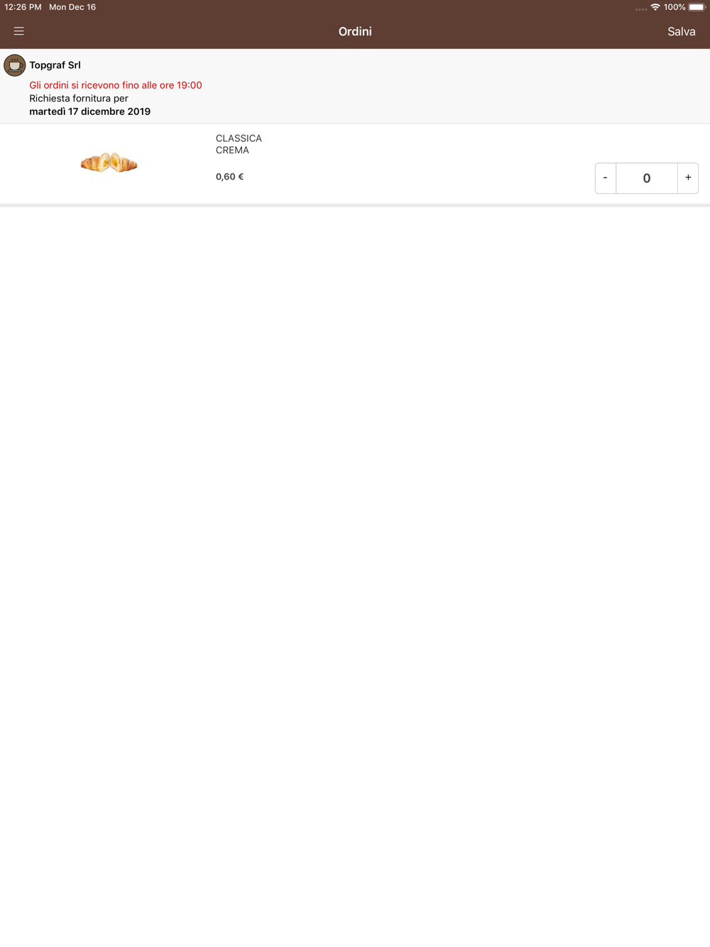 Questa App permette la gestione dei vostri ordini con frequenza giornaliera sulla base di un catalogo prodotti predefinito.