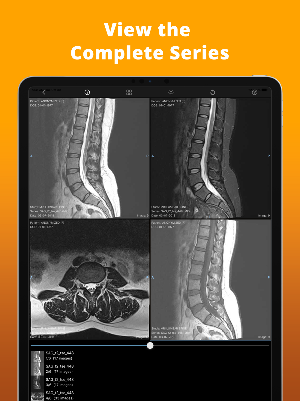Access Ambra Health's award-winning medical image management suite right from the palm of your hand. Users can effortlessly view imaging from anywhere, scroll through a series, and utilize radiology tooling like zooming, pinching, and rotating all from the palm of their hand. While not intended for diagnostic use, imaging can be securely shared directly from within the app to other physicians, administrators, and patients for enhanced communication and collaboration.
