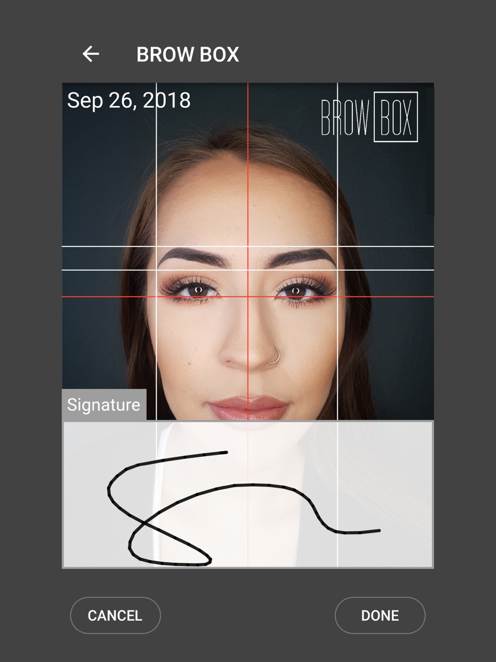 Welcome to Browbox Grid! A tool specifically designed for cosmetic micropigmentation/microblading industry professionals. The movable grids aid with the visualization of eyebrow symmetry. The app is also here to aid the artist with the process of the shape determination signoff. Once the design is approved upon by client and artist, the artist can get the client to sign the approval of shape in the app prior to proceeding with the procedure. With two options, the artist can choose to have the signed design with or without the grid lines.
