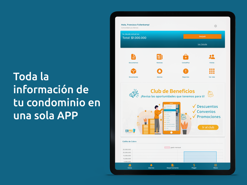 EdiPro es la solución más completa que podrás encontrar para tu condominio. Podrás conocer el detalle de tus gastos comunes y pagarlos online, tener un registro de tus visitas, ser notificado de encomiendas, recibir noticias de tu comunidad, hacer reserva de las áreas comunes, crear reportes y mucho más. Y todo desde la comodidad de tu teléfono.