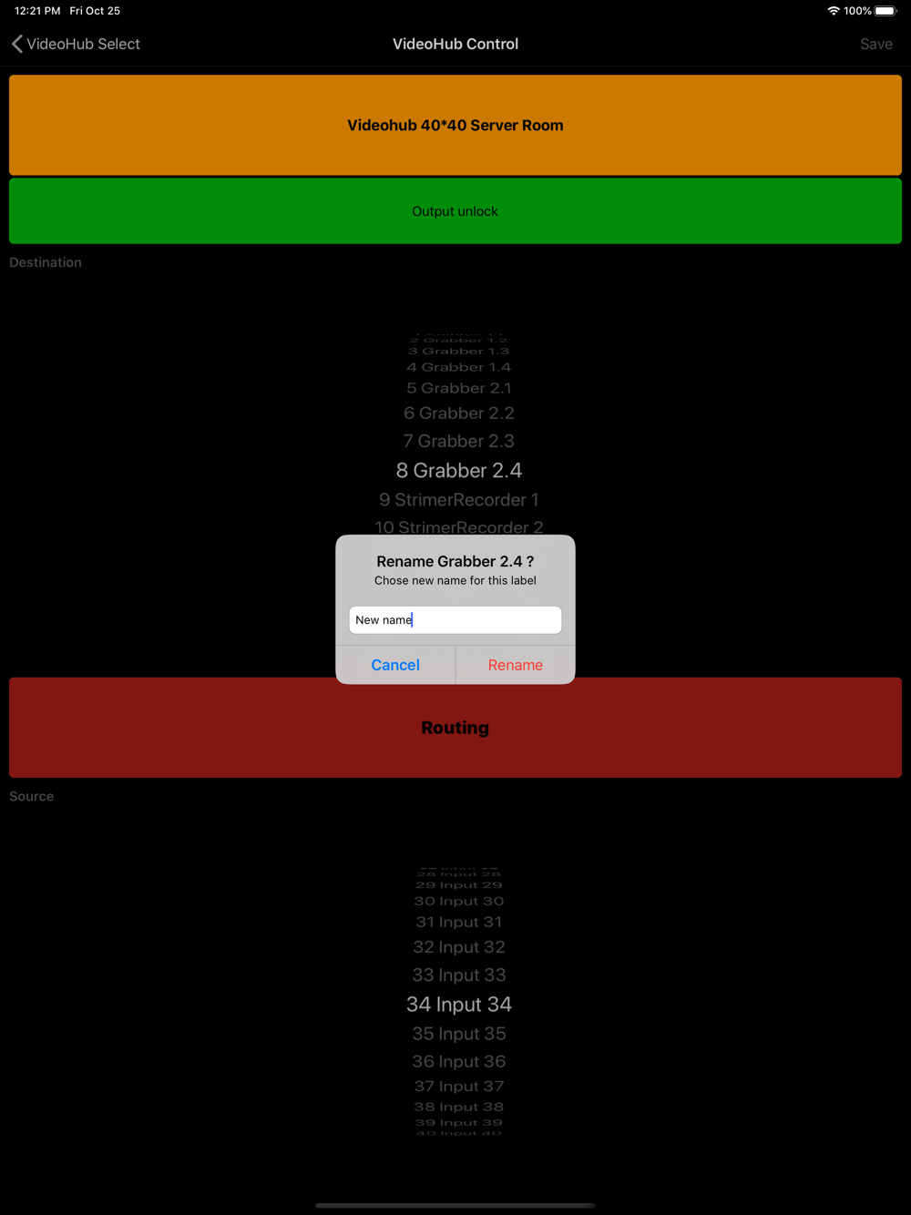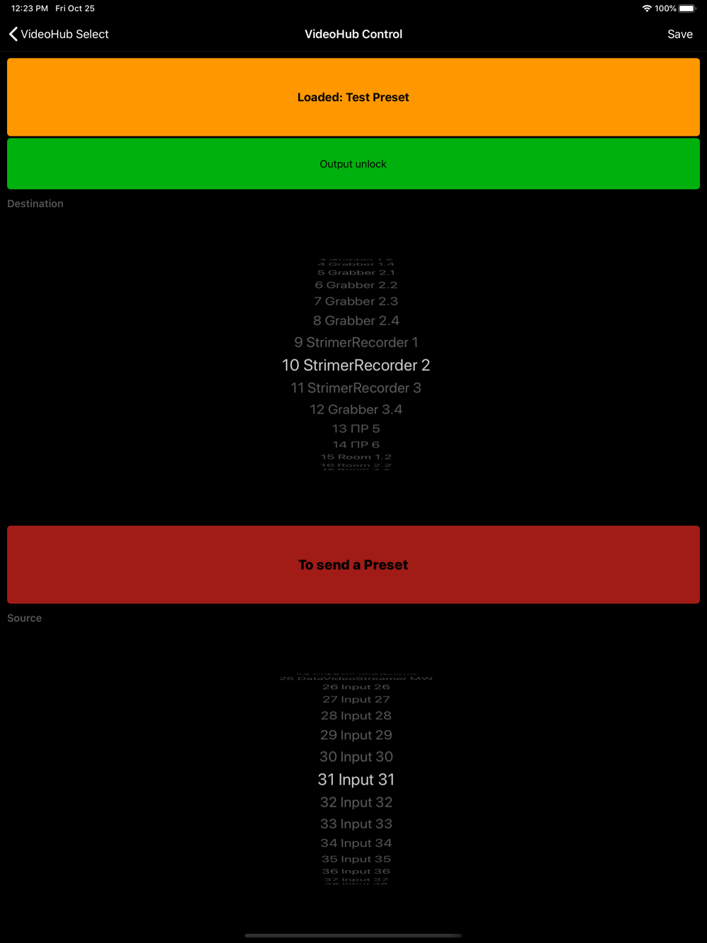 This app is designed for remote control of matrix video hub Blackmagic Smart Videohub, Compact Videohub, Micro Videohub, and other Blackmagic VideoHub’s. Add your video Hubs, save and load presets
