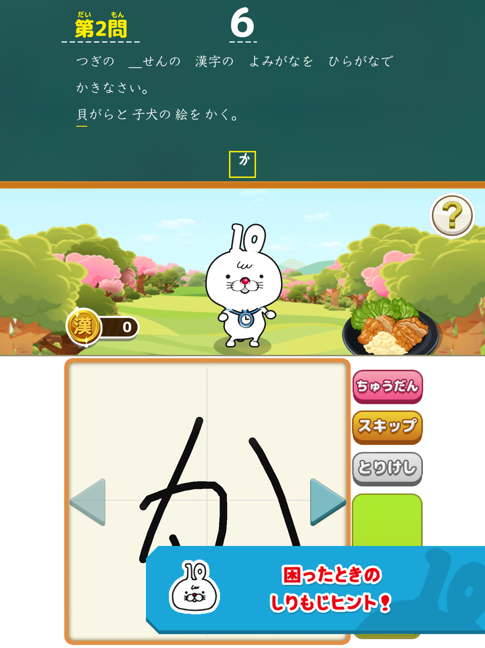 問題が解けなくて困ったときは、「いちまる」がしりもじヒントを出してくれます。