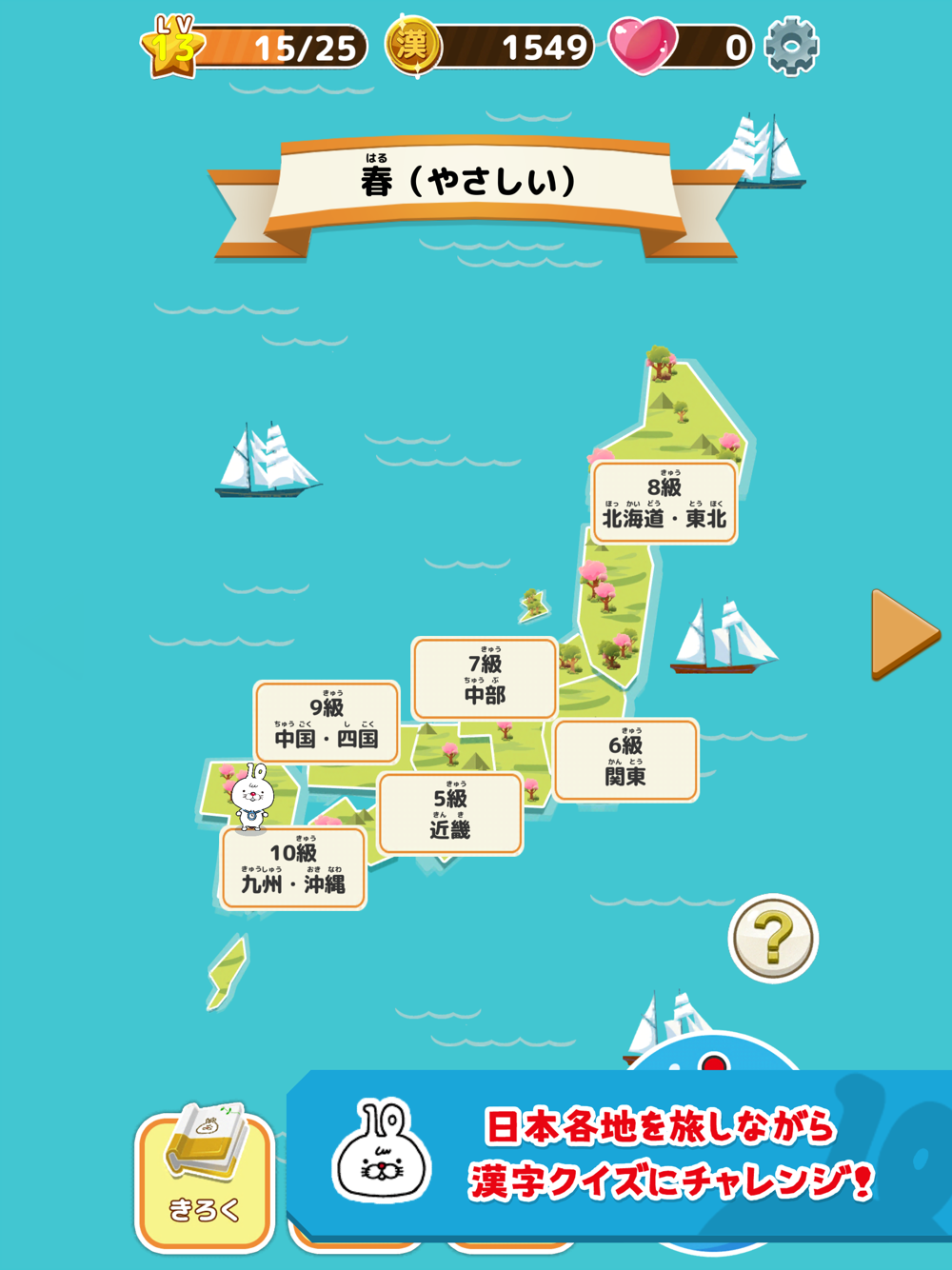 日本各地を旅しながら漢字問題を解いていくと、新しいキャラクターやきせかえアイテムをゲットできます!