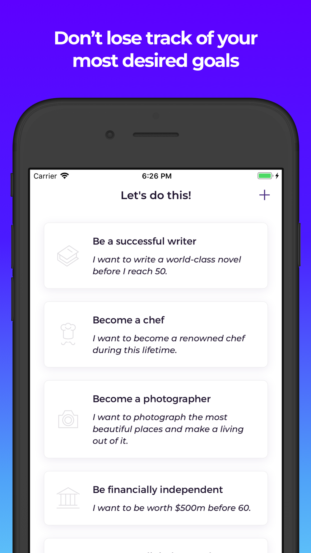 This isn't a habit tracking app, a tasks app, nor a project tracking app. Its only purpose is to help you remain on track, so you never forget where you actually want to end up in life.
