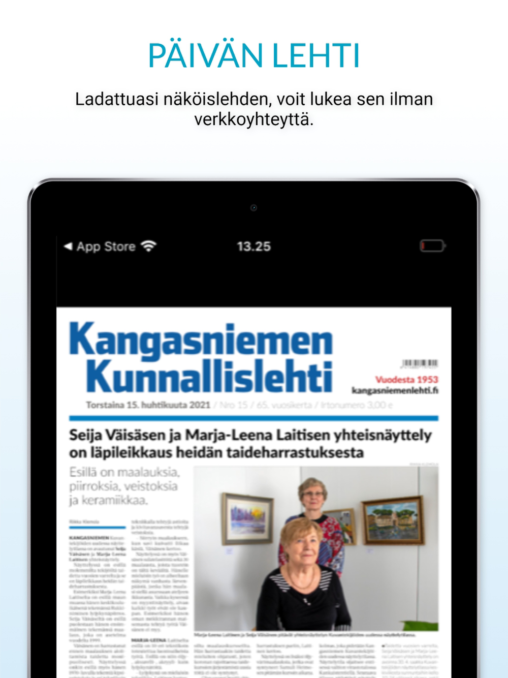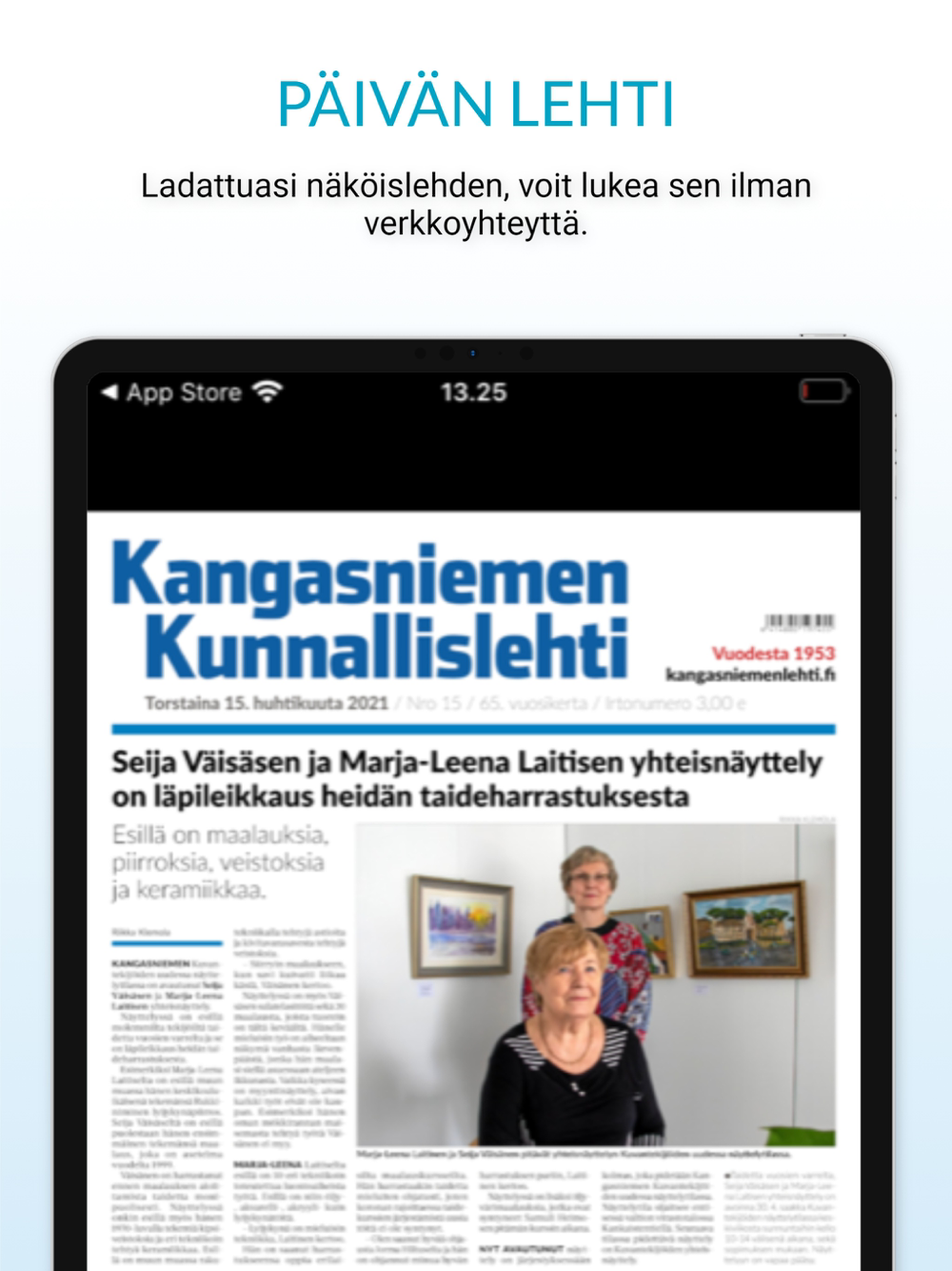 Sovellus sisältää uusimman julkaistun näköislehden sekä lehtiarkiston ja liitteet. Voit lukea sovellukseen lataamiasi lehtiä myös ilman verkkoyhteyttä missä vain ja milloin haluat.
