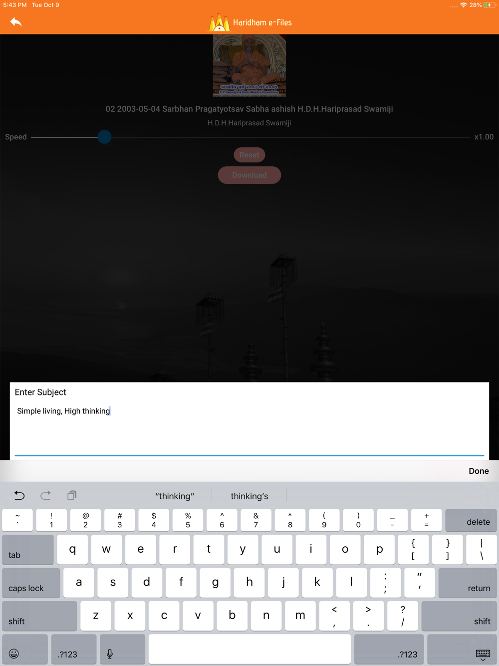 Any aspirants walking on the path of spirituality must have deep knowledge and understanding of the particular religion, in order to gain utmost benefit. To facilitated this analysis and review process, we have developed an unique mobile app “Haridham e-Files” that enables aspirants with required files in audio/video format wherein user can create Playlist, Add/Edit Bookmark and Comment on the Audio/Video files.
