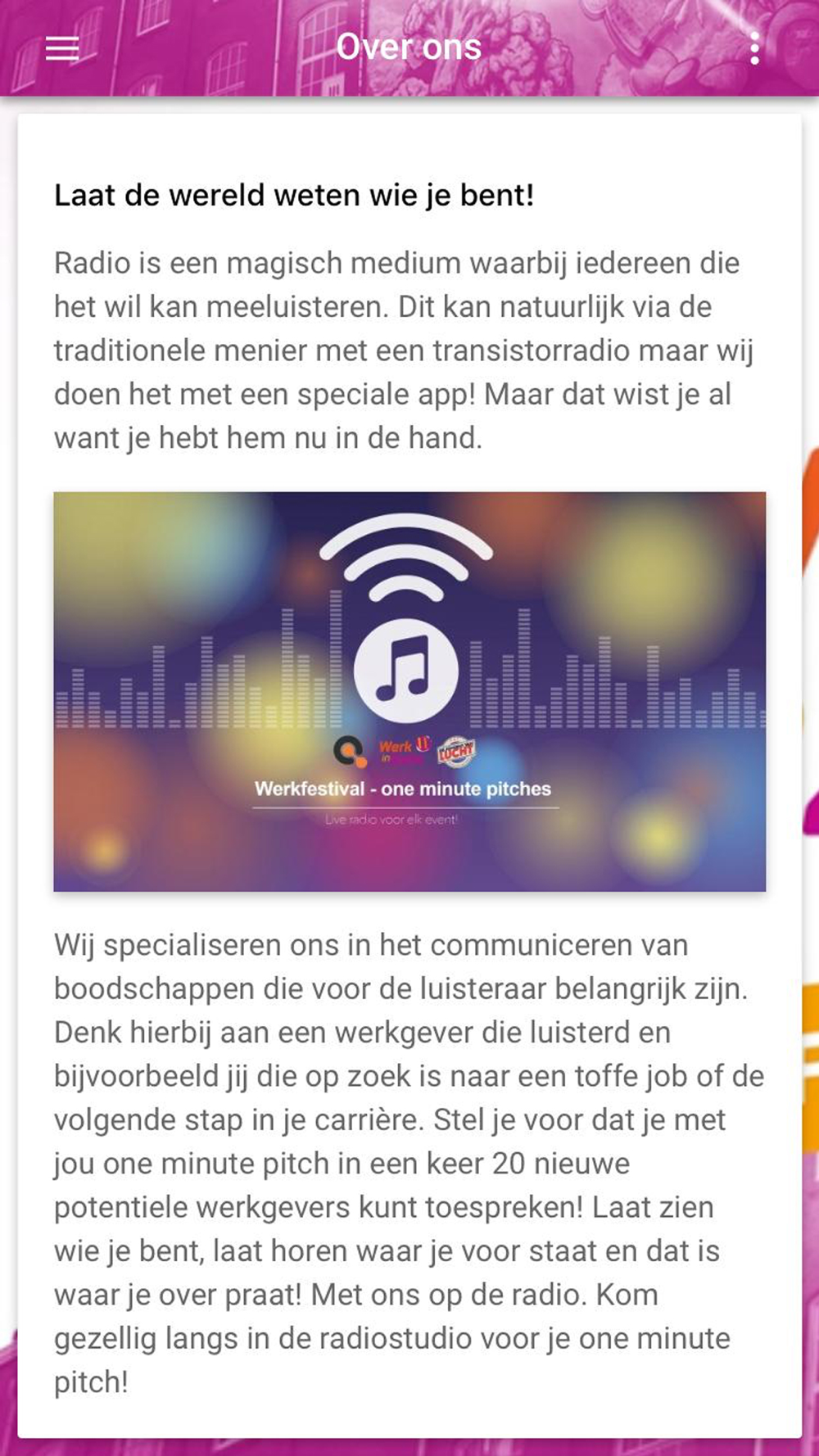 Verwacht geen standaard banenbeurs met stands, mannen in pakken en folders, maar een bannervrij festival waar het bruist van de energie en van alles te beleven en ervaren is!